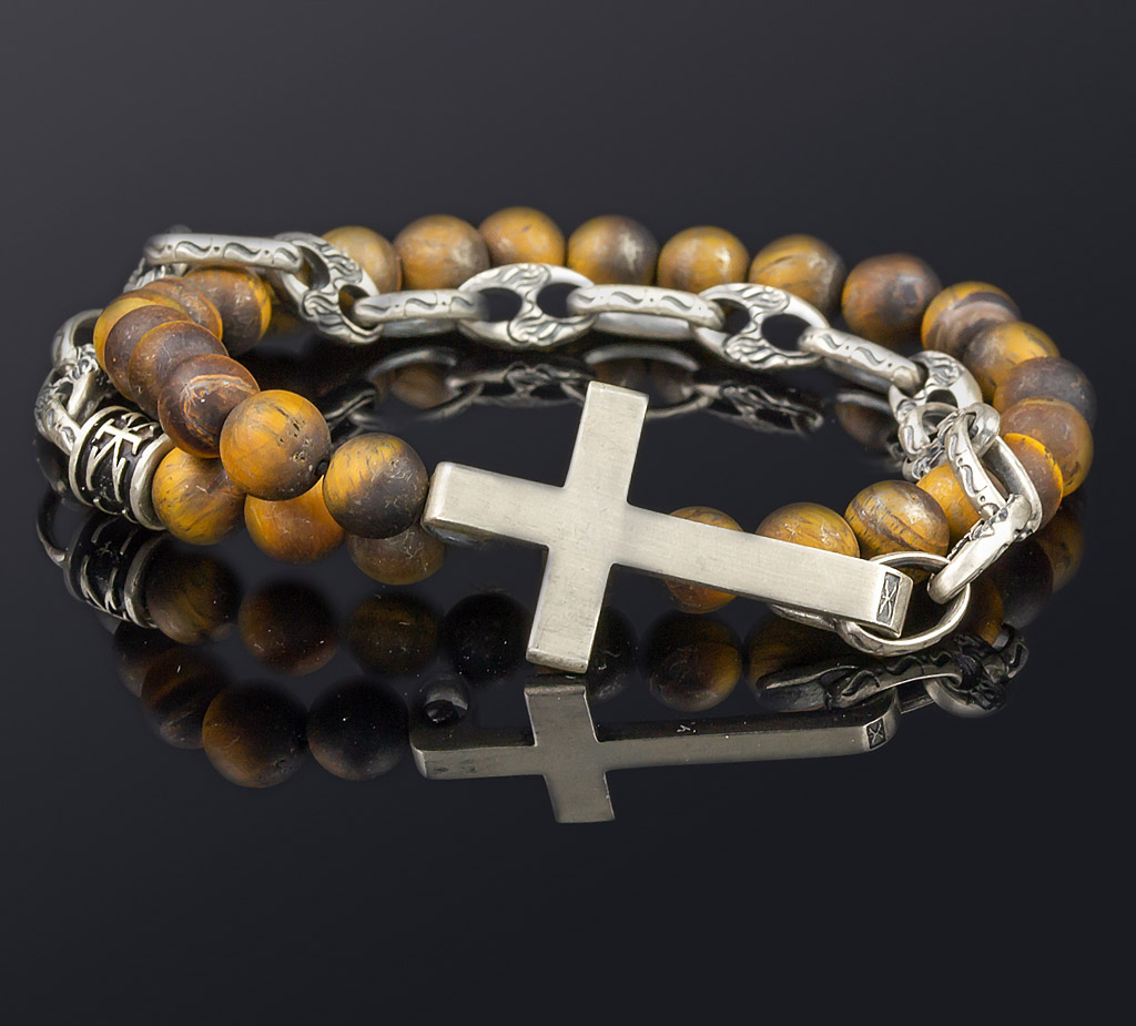 Brown Bracelet: Sterling silver double bracelet with cross, link and tiger eye