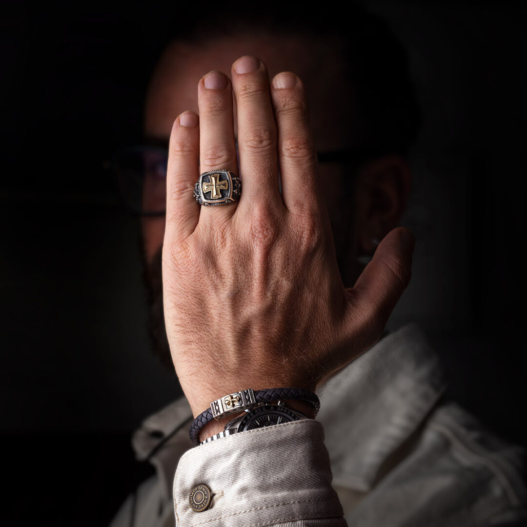 Bracelet with Sterling Silver & K14 Gold with cross and braided genuine leather.