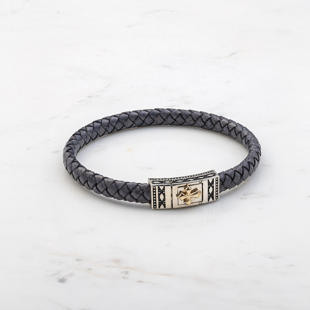 Bracelet with Sterling Silver & K14 Gold with motifs fleur-de-lis and braided genuine leather.