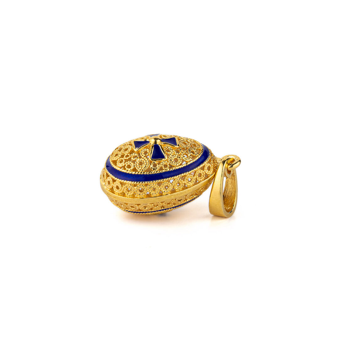A beautifully crafted egg-shaped pendant with a cross, made of 925 sterling silver and gold plated decorated with enamel and very detailed filigree motifs.
