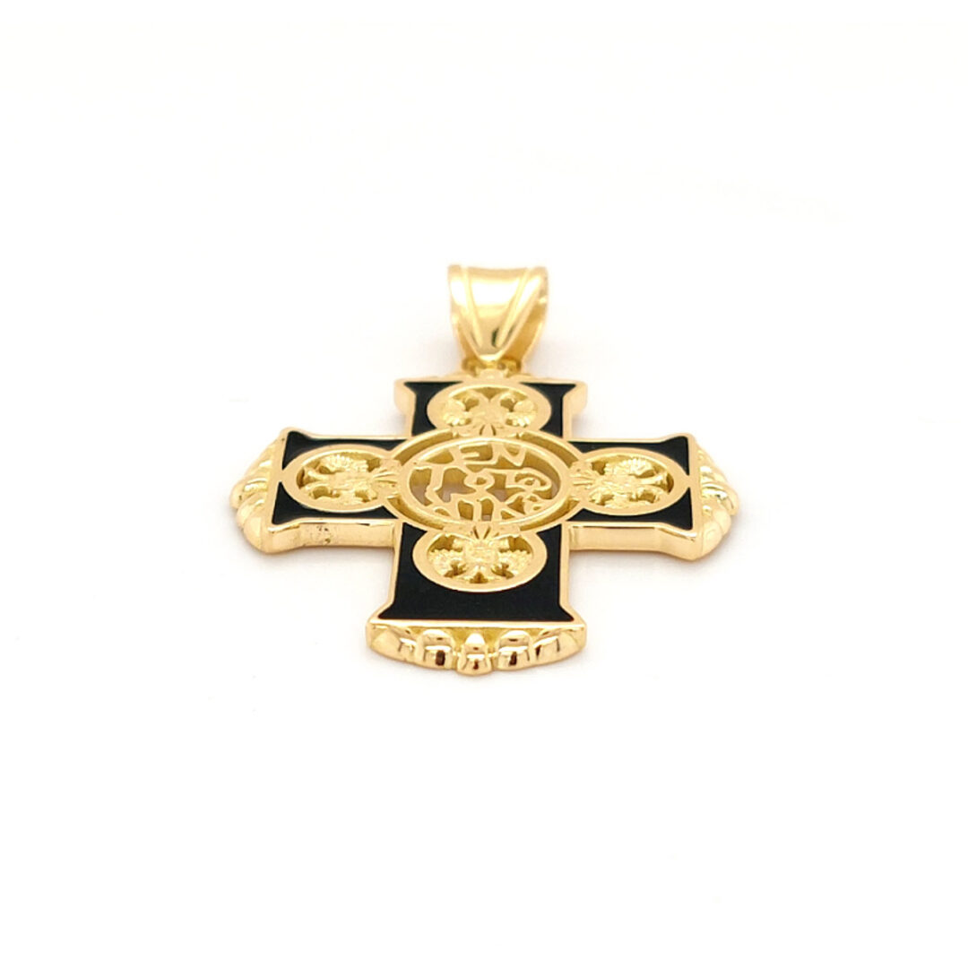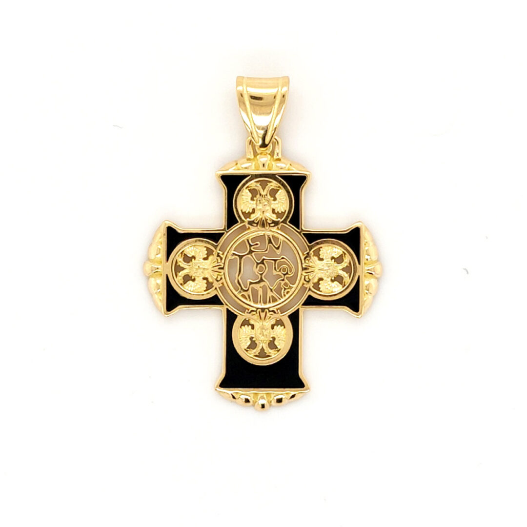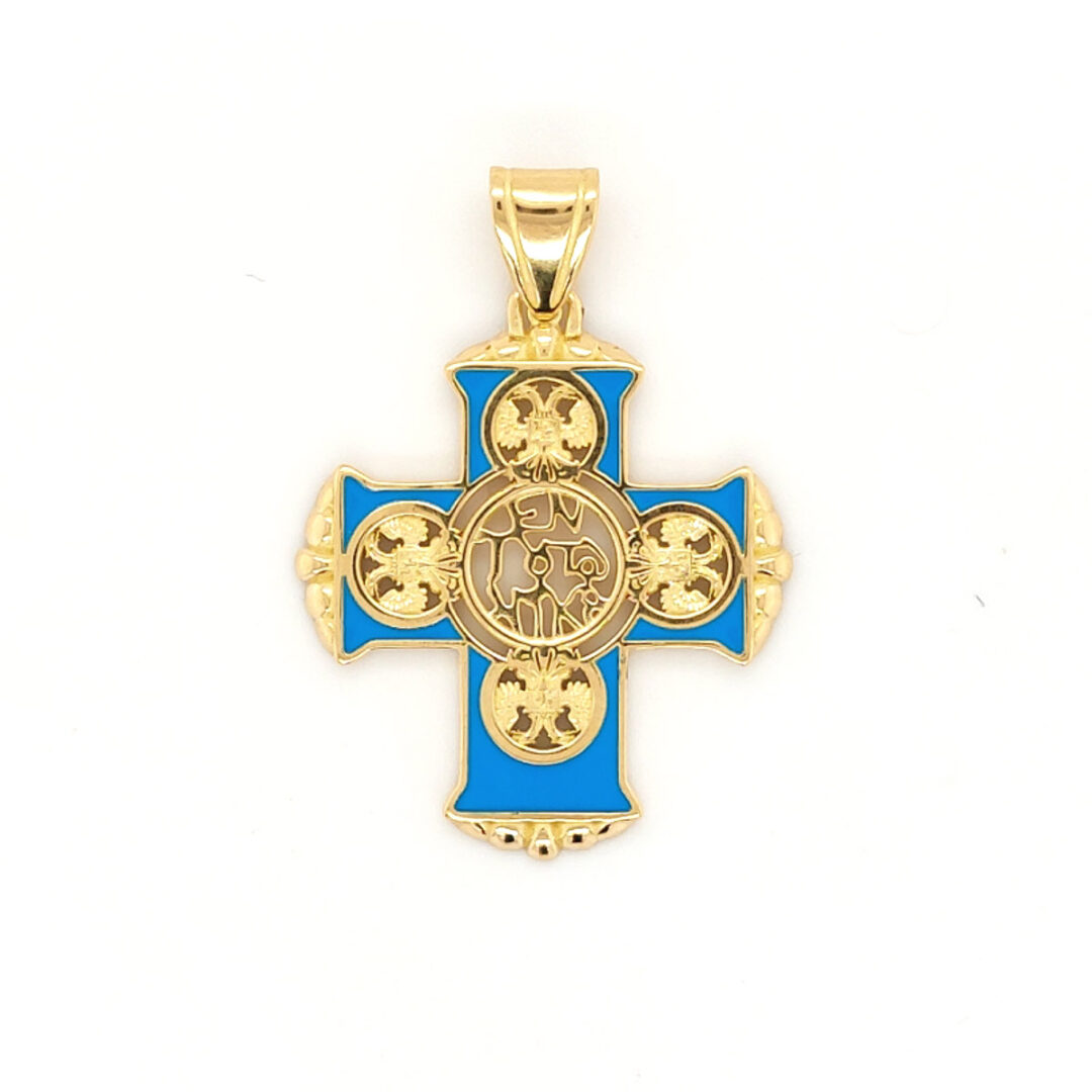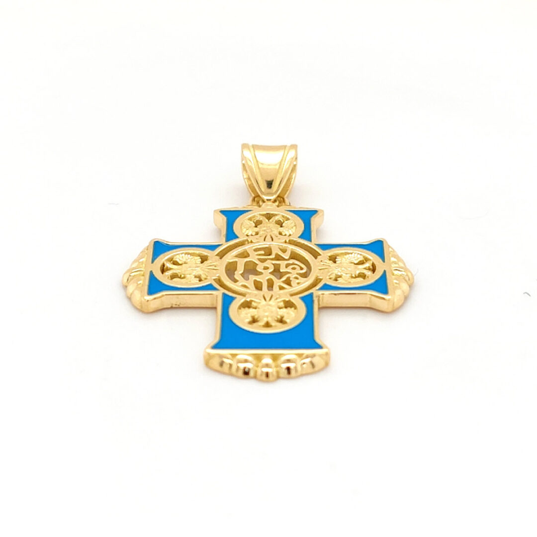 A unique golden cross with turquoise enamel.At the center of the cross there is the inscription “En Touto Nika”, which is literally meaning “in this, conquer”.