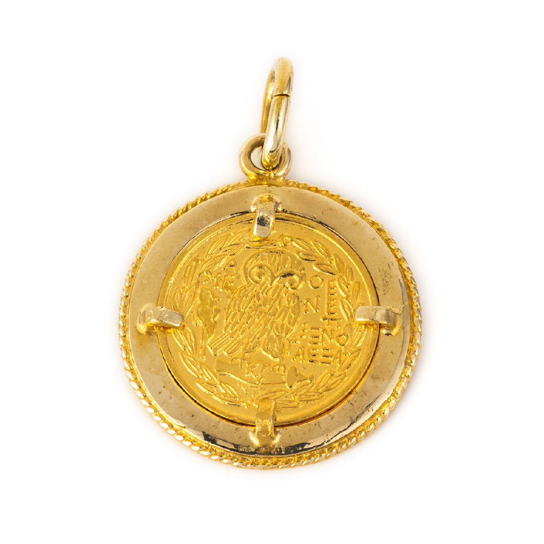 The front side of this pendant is decorated with Goddess Athena and the back side is decorated with the wisdom owl