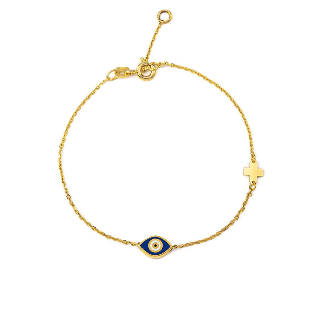 Evil Eye Blue Enamel Bracelet with Cross – Sterling Silver and Gold Plated