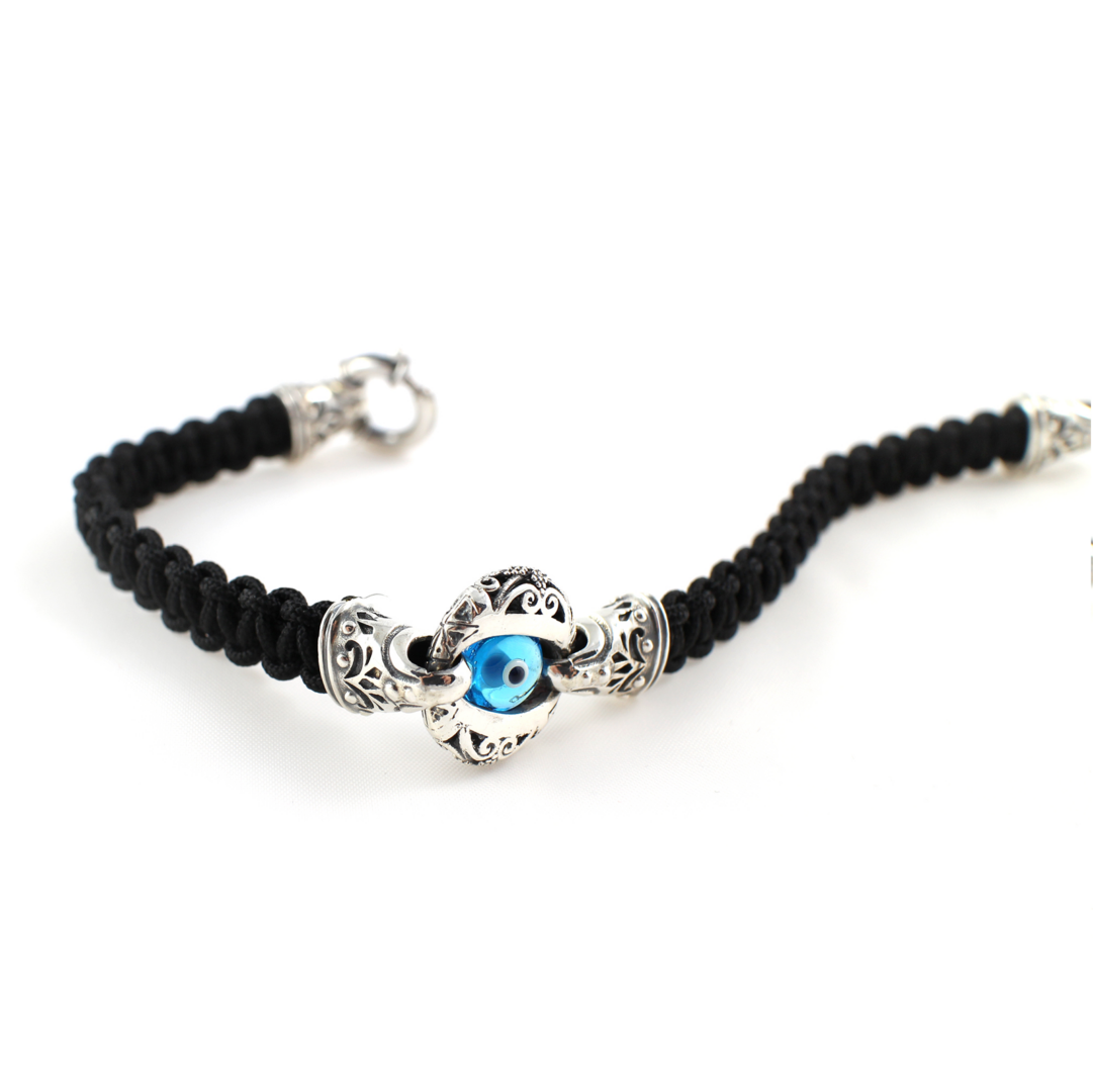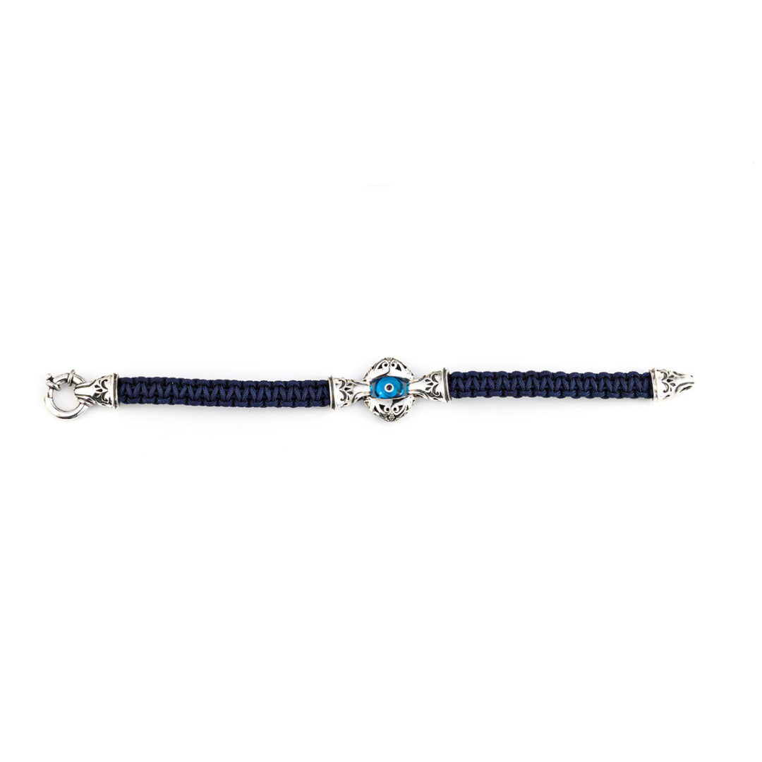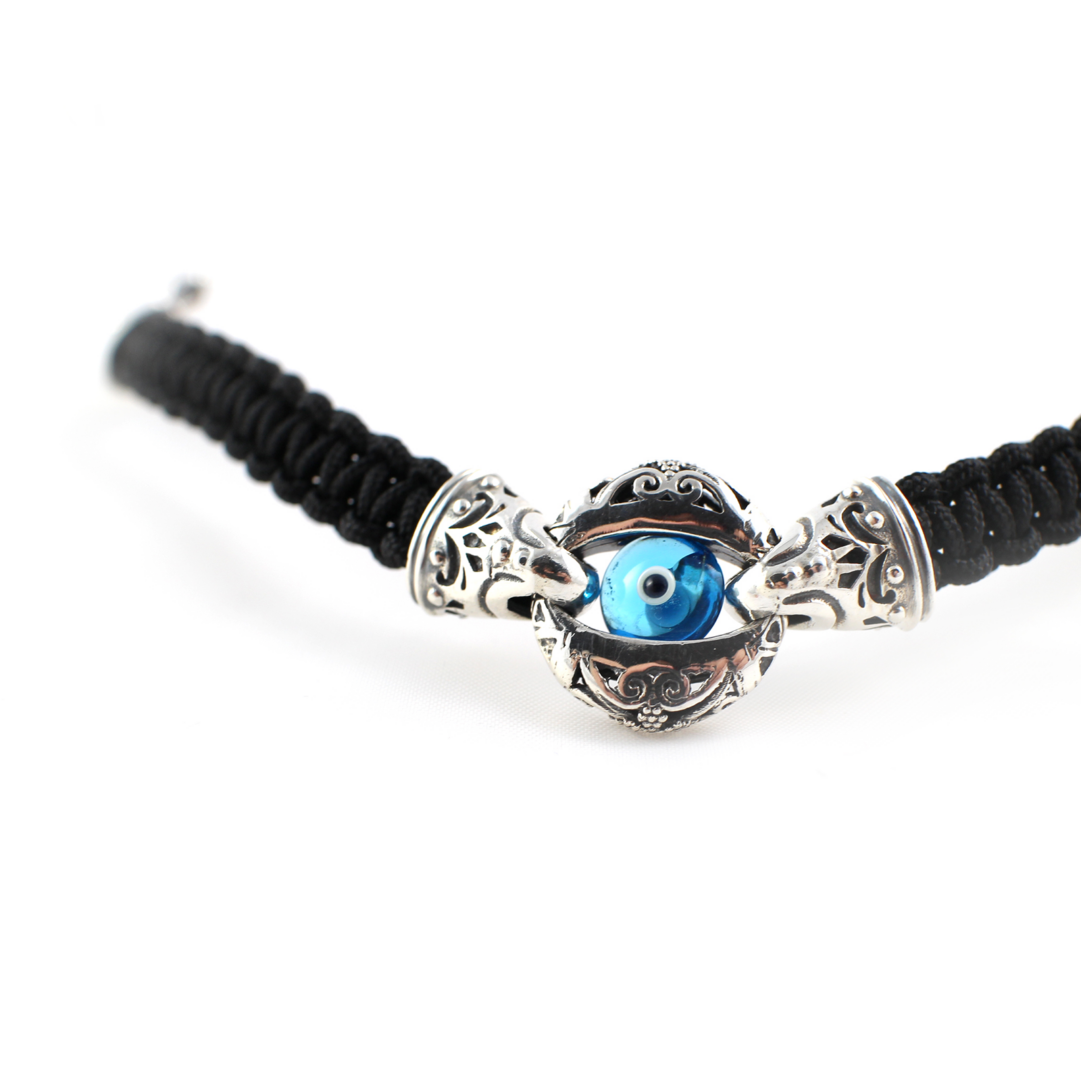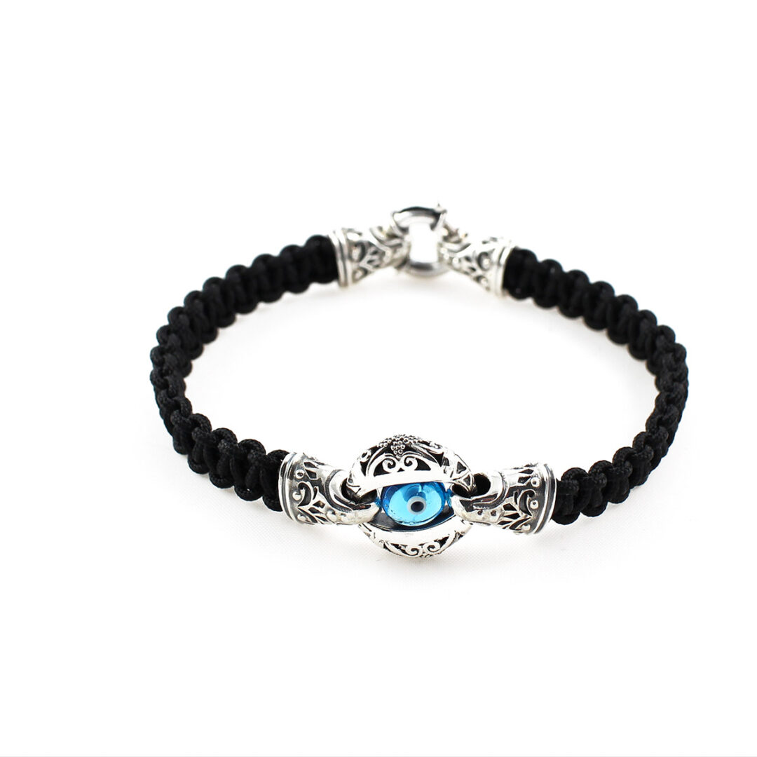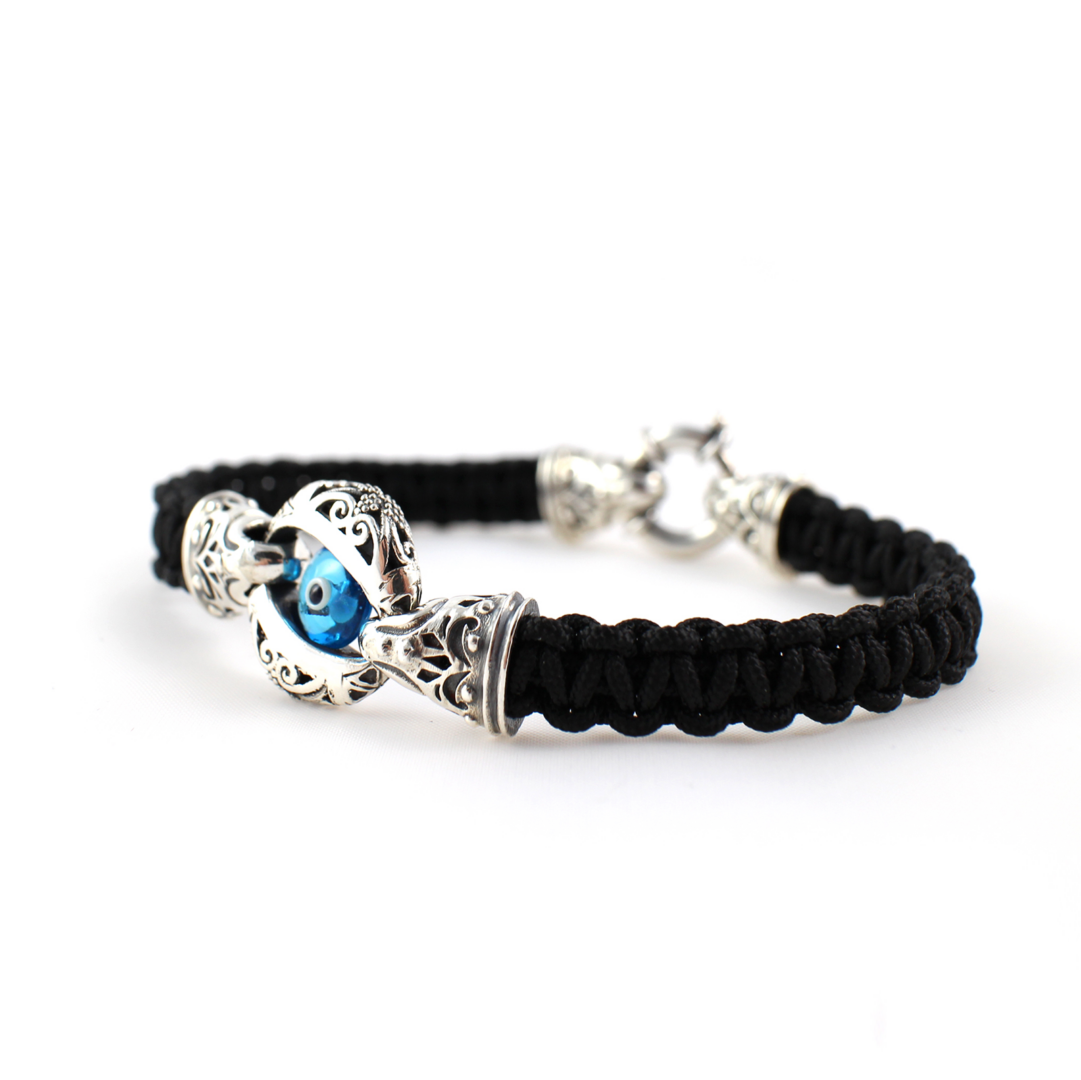 Evil Eye Macrame Bracelet – Sterling Silver Yianni Jewelry. The evil eye is a look that is believed by many cultures to be able to cause injury or bad luck for the person at whom it is directed for reasons of envy or dislike. Attempts to ward off the curse of the evil eye has resulted in a number of talismans in many cultures. Balls, consisting of concentric blue and white circles (usually, from inside to outside, dark blue, light blue, white, dark blue) representing an evil eye are common apotropaic talismans in the Middle East, which are supposed to bend the malicious gaze back to the sorcerer.