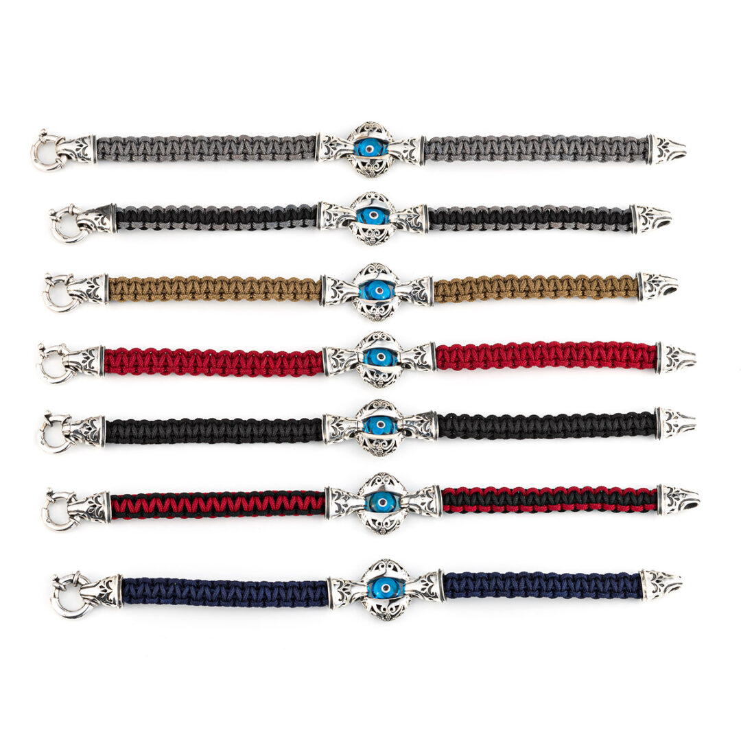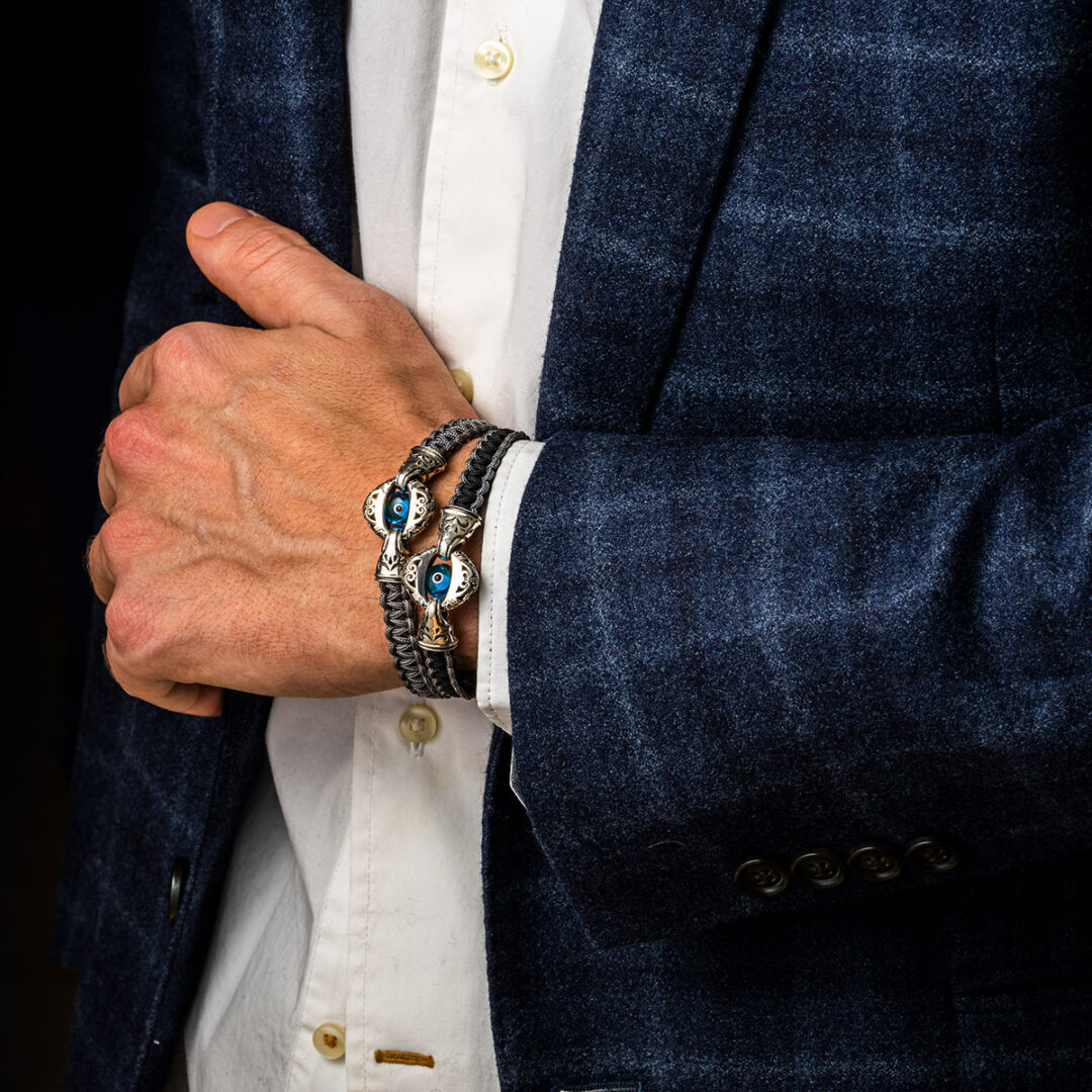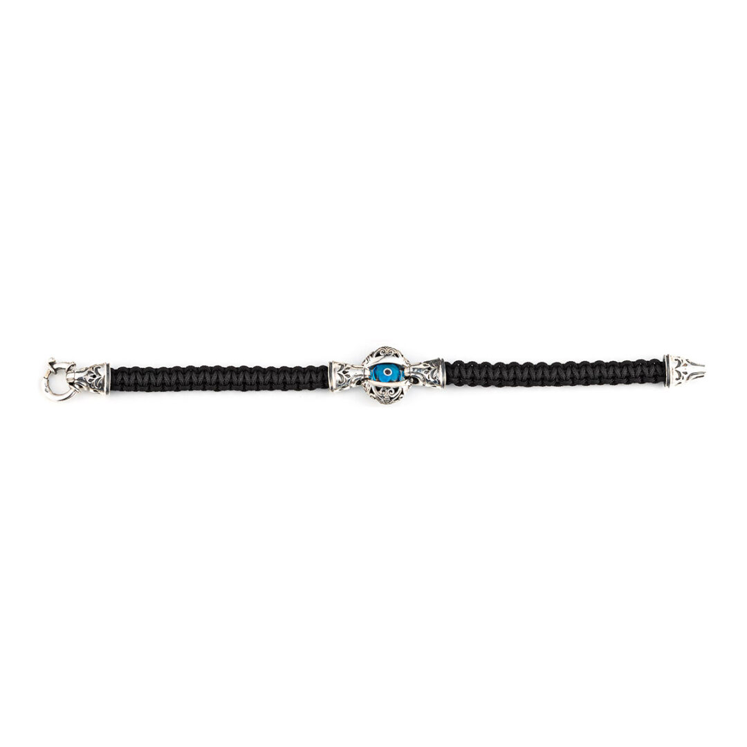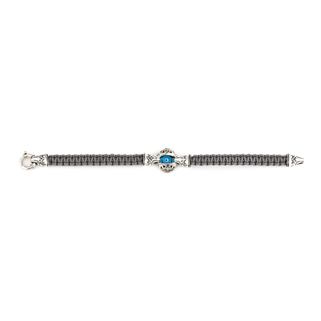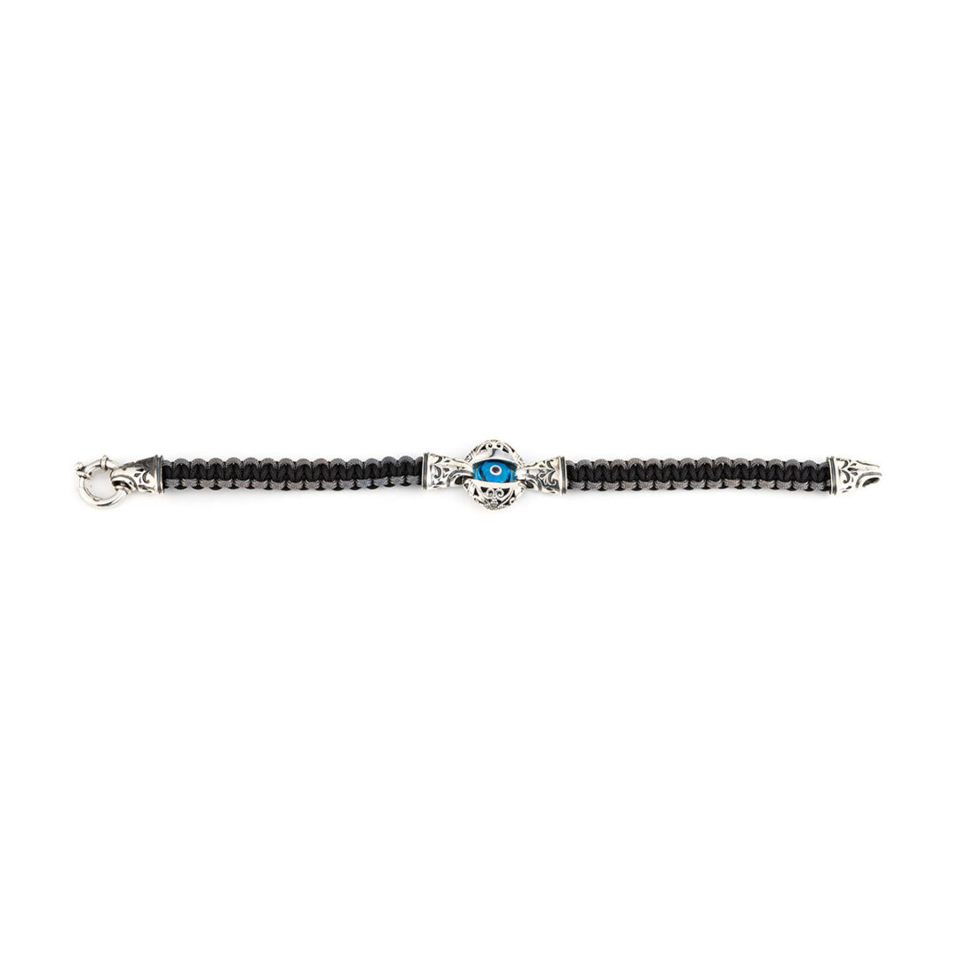 Evil Eye Macrame Bracelet – Sterling Silver Yianni Jewelry. The evil eye is a look that is believed by many cultures to be able to cause injury or bad luck for the person at whom it is directed for reasons of envy or dislike. Attempts to ward off the curse of the evil eye has resulted in a number of talismans in many cultures. Balls, consisting of concentric blue and white circles (usually, from inside to outside, dark blue, light blue, white, dark blue) representing an evil eye are common apotropaic talismans in the Middle East, which are supposed to bend the malicious gaze back to the sorcerer.