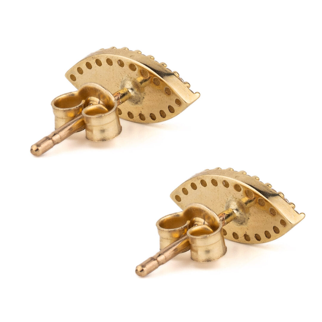 A beautiful pair of evil eye stud earrings made of 9K Gold and decorated with zircons.