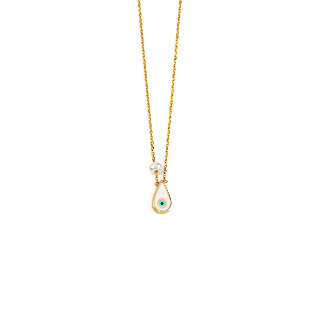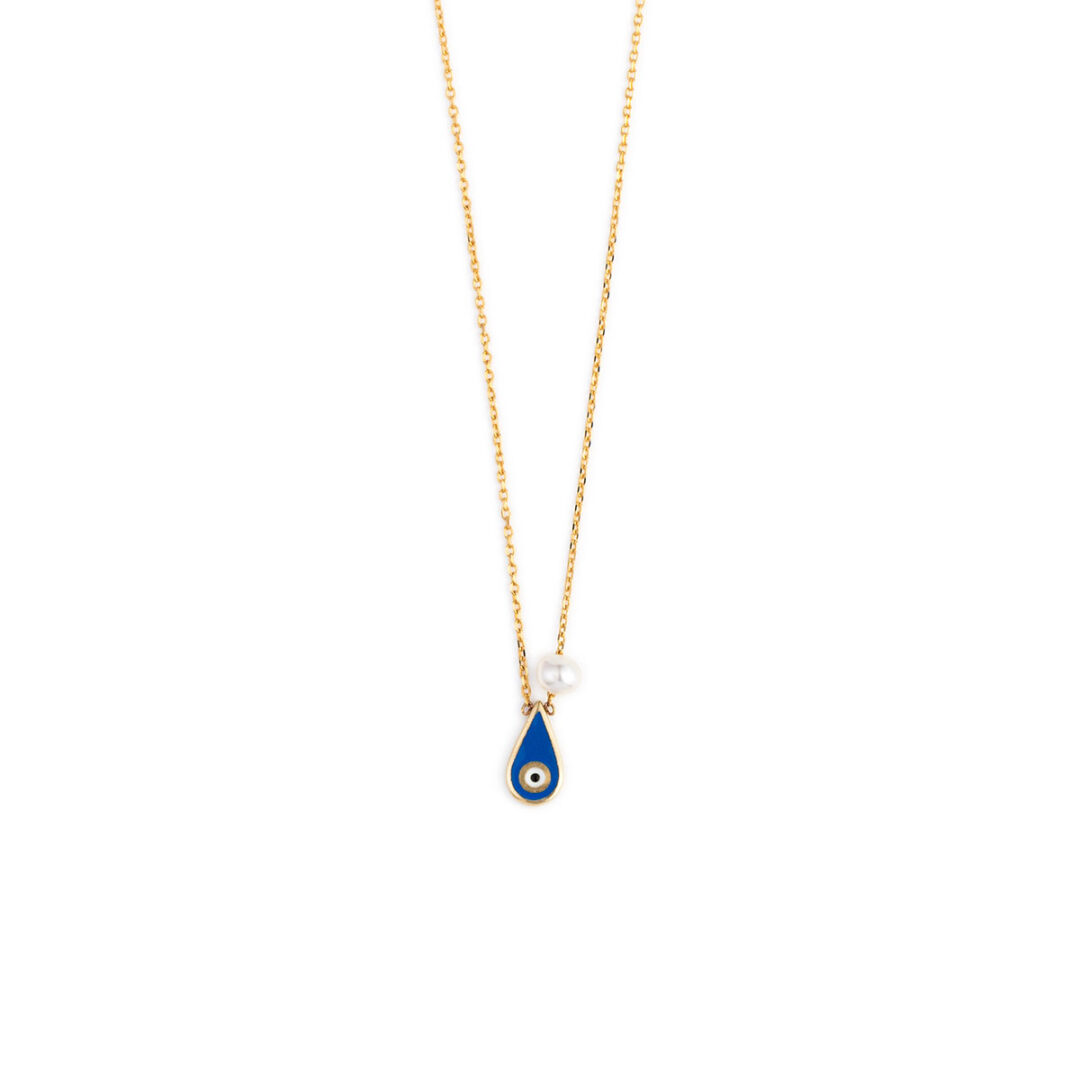 Evil Eye Tear Drop Necklace with Pearl – 14K Yellow Gold with Blue Enamel