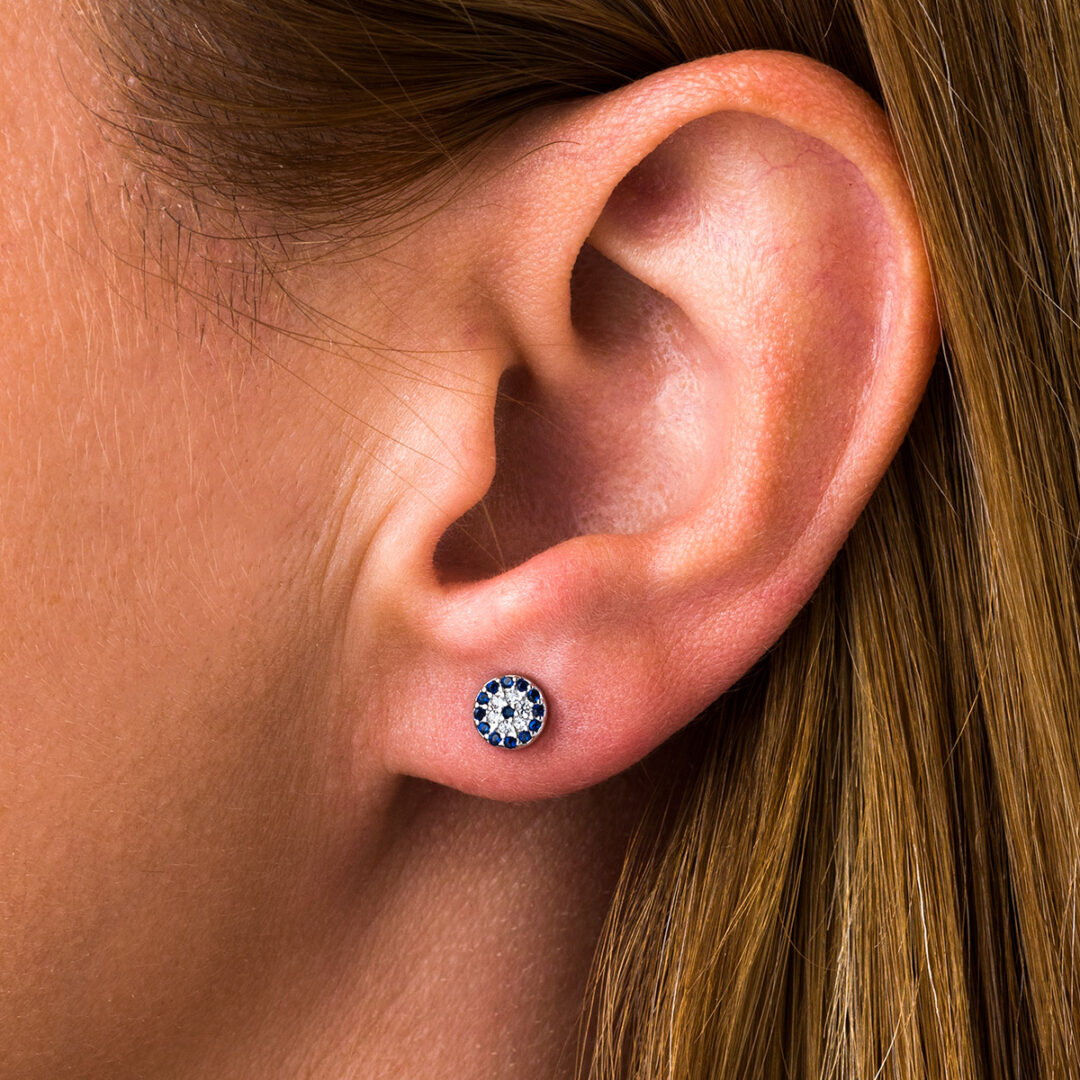 A beautiful pair of evil eye stud earrings made of 925 sterling silver and decorated with zircons.
