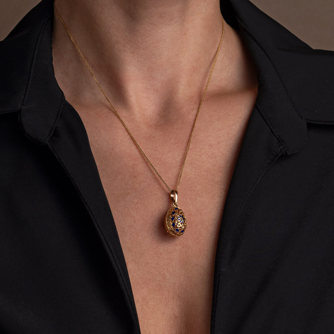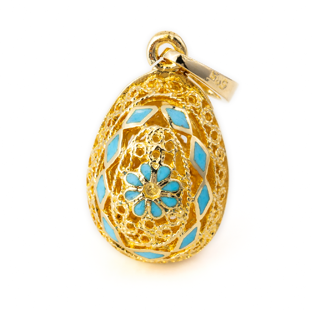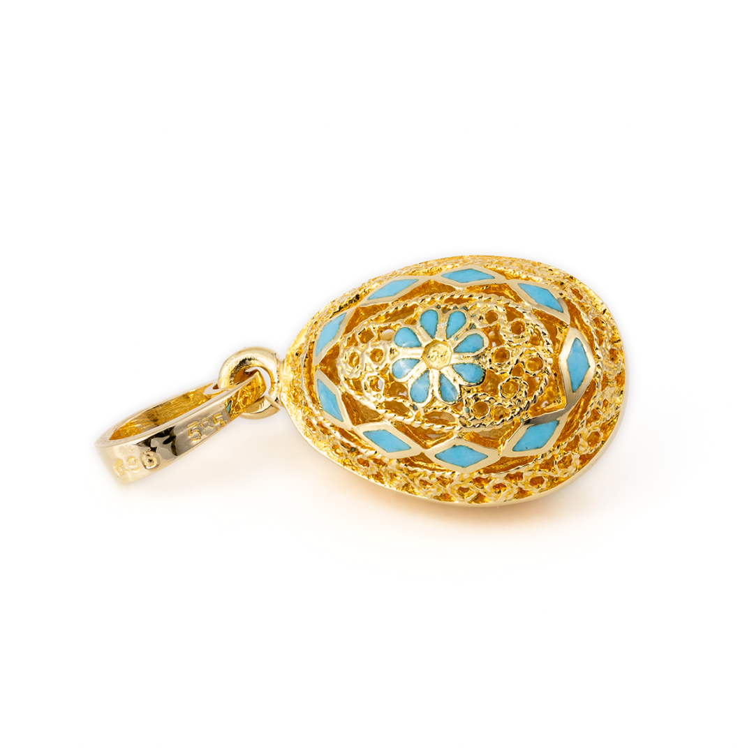 Filigree Egg Pendant with Rosette Flower – 14k Gold and Turquoise Enamel