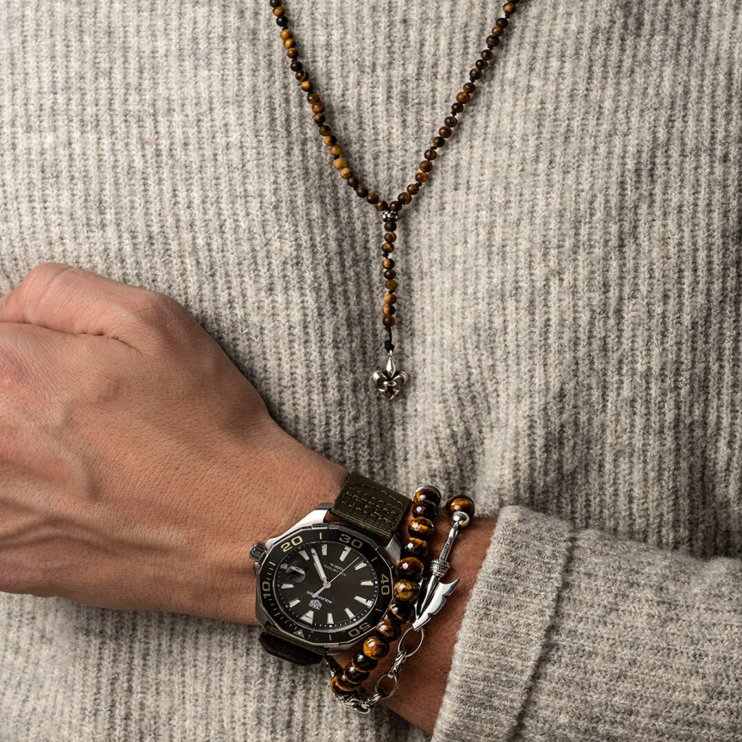 Fleurs De Lis Rosary Necklace with Tiger Eye Beads – 925 Sterling Silver