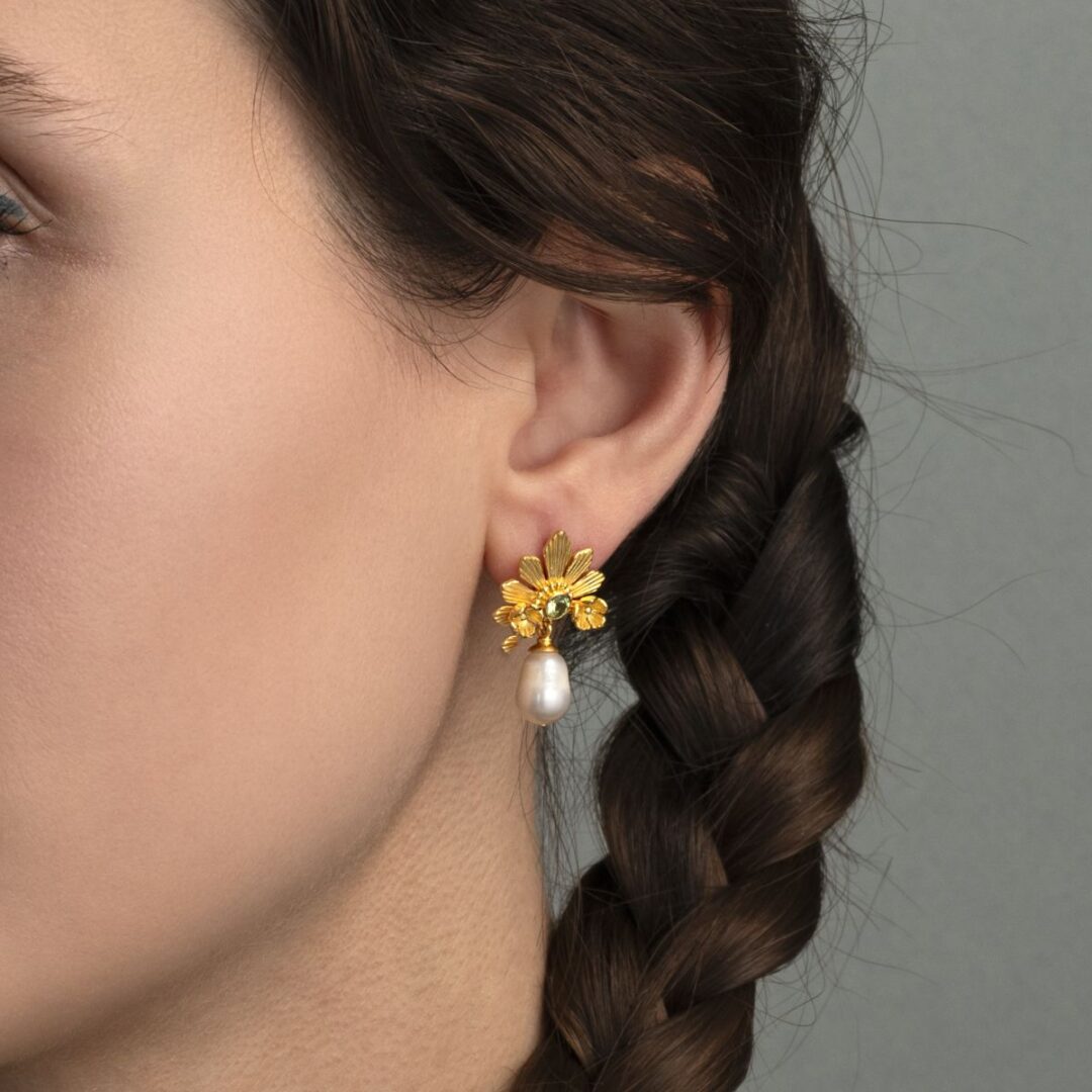 Flower Pearl Stud Earrings in Gold-Plated & 925 Sterling Silver with Peridot