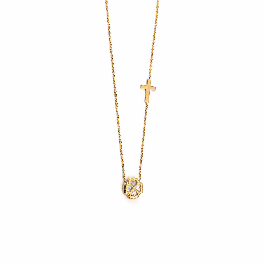 Four Leaf Clover Necklace with Cross – 9K Yellow Gold