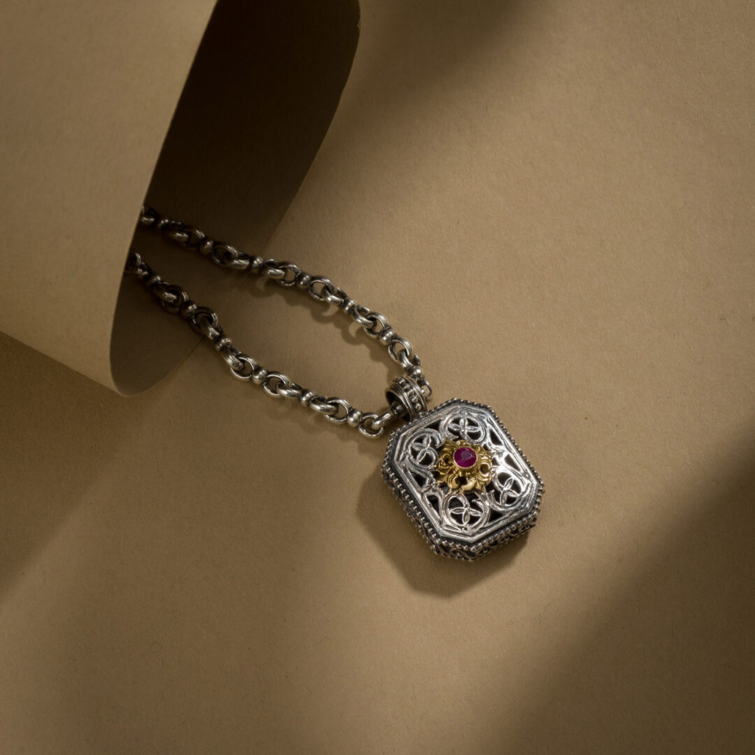Pendant in 18K solid Yellow Gold and sterling silver with ruby.