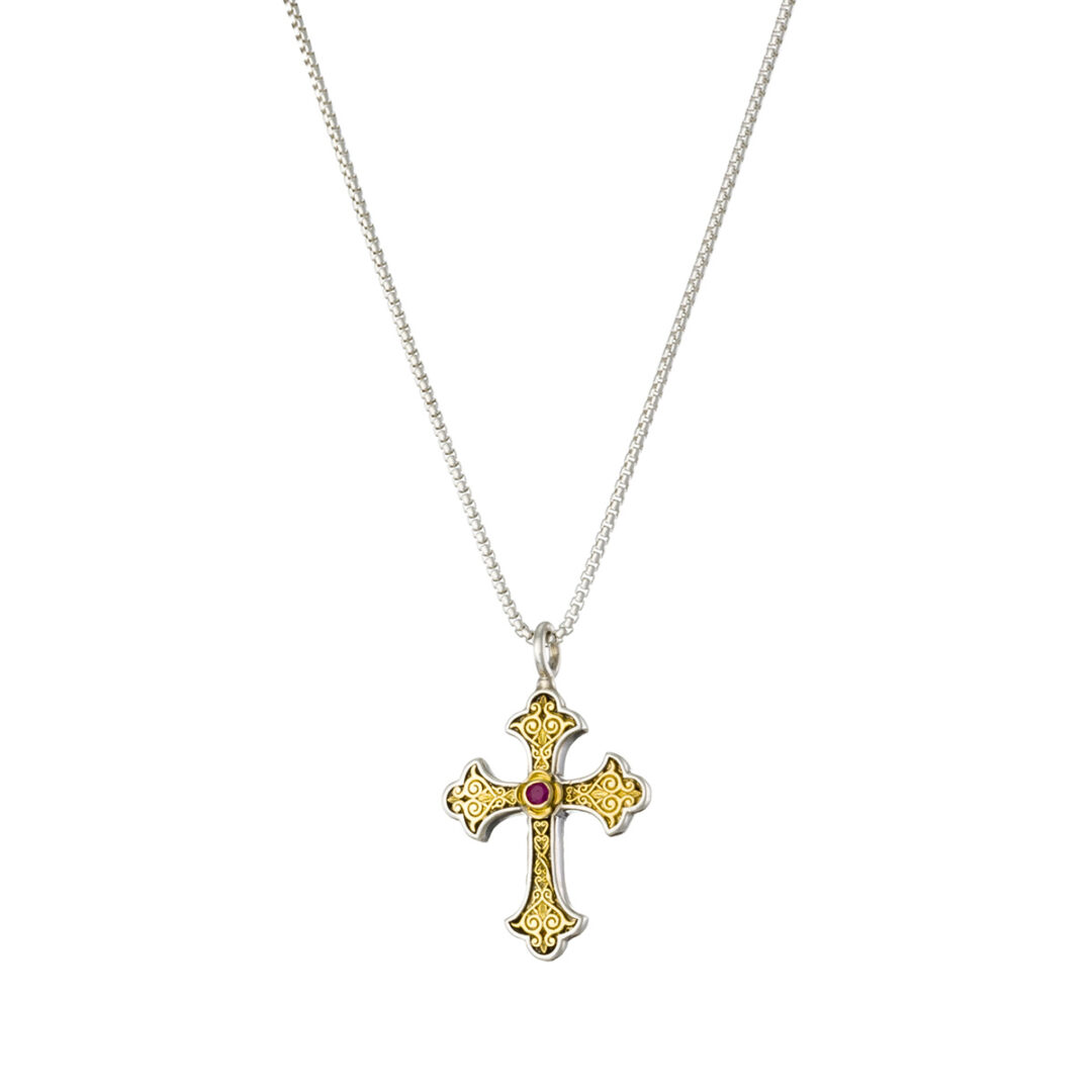 Cross in 18K solid Yellow Gold, sterling silver and ruby.