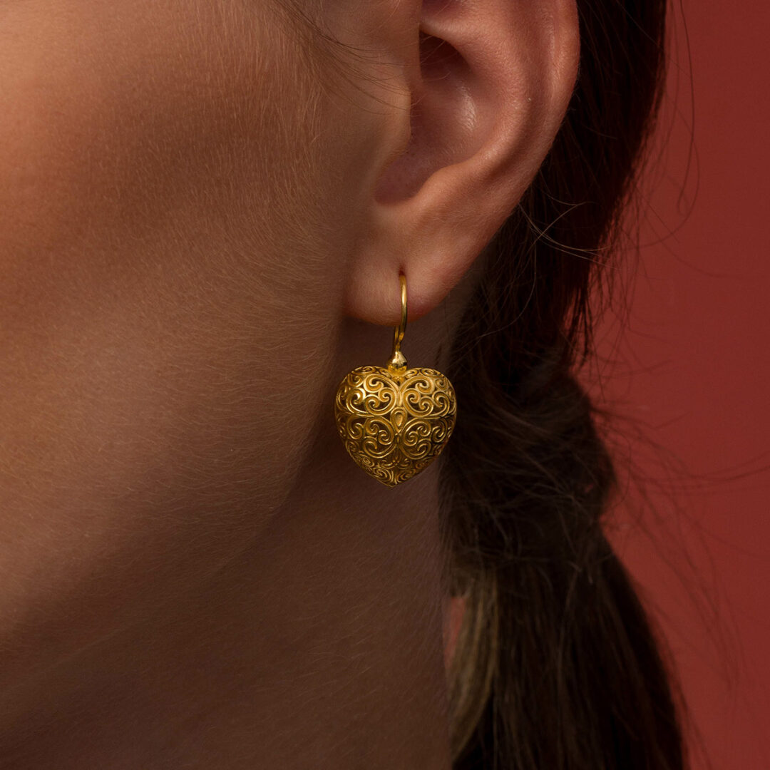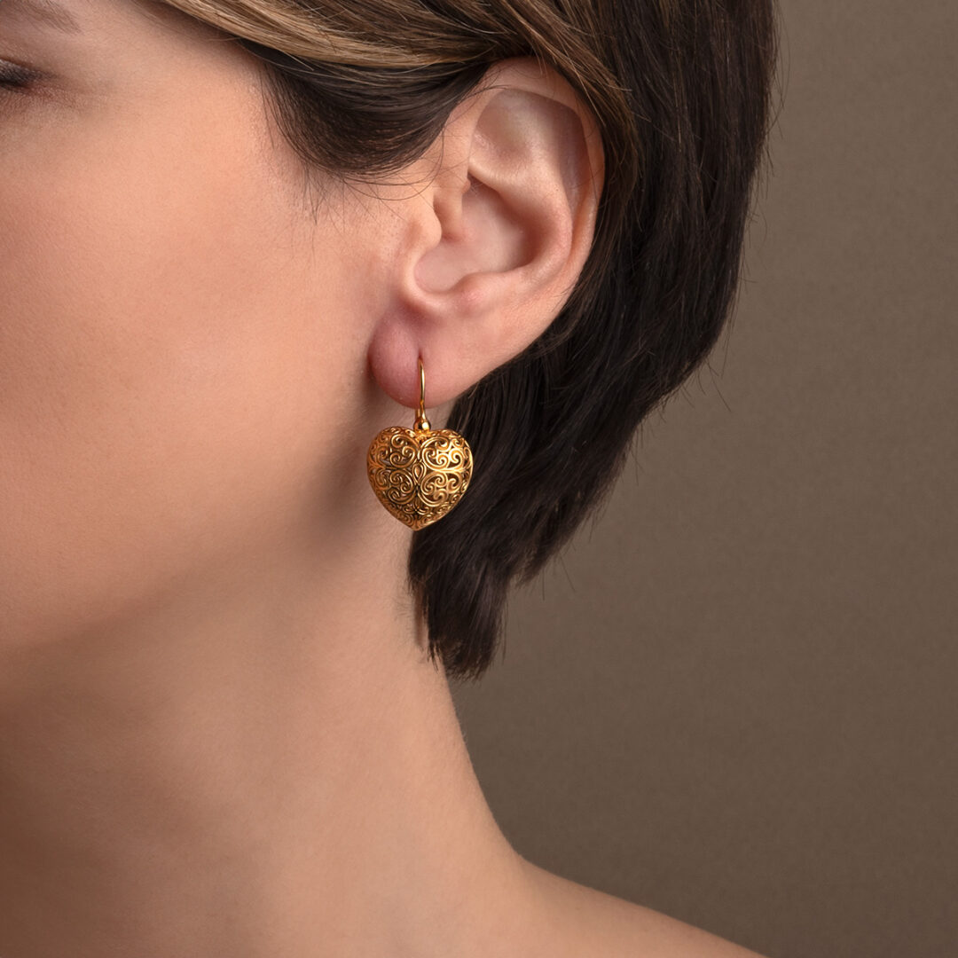 Heart earrings in gold plated silver 925, decorated with filigree, handcrafted with the finest attention to detail.