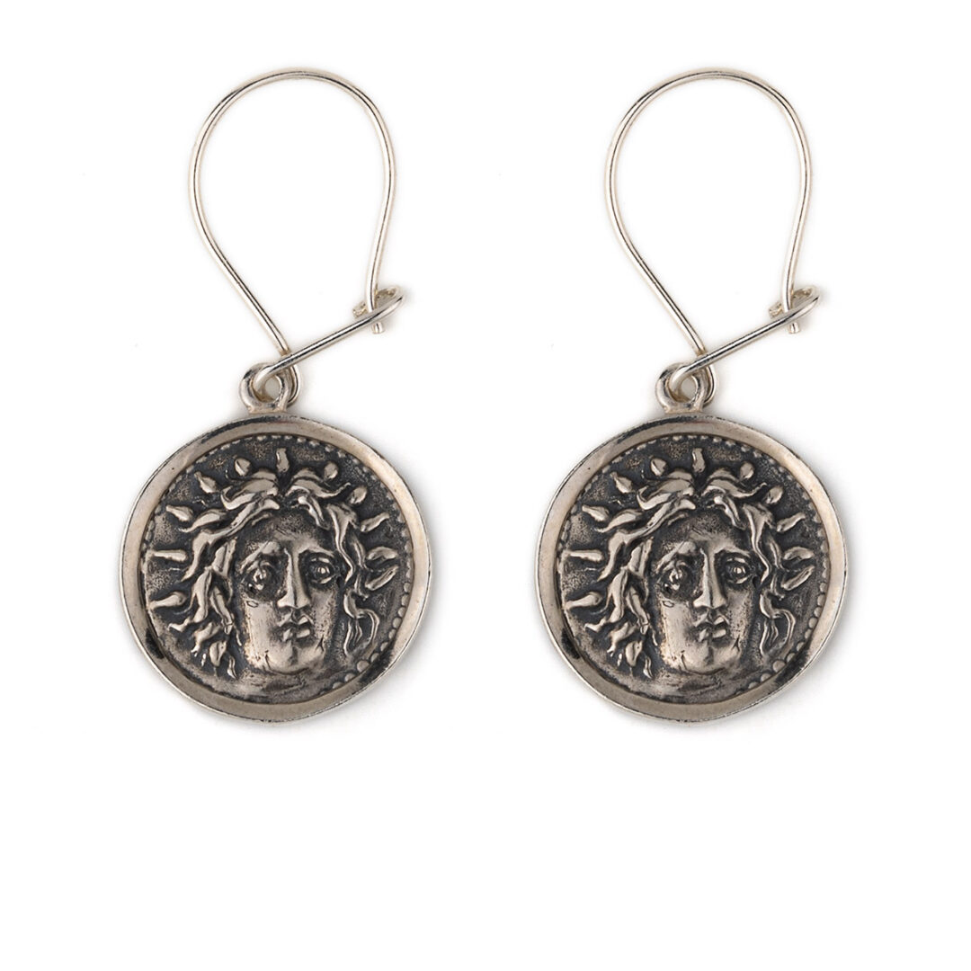 Ancient Greek coin from Rhodes island with God Helios, the sun god identified with the God Apollo. This coin illustrate God Apollo on the one side and the flower rhodon (rose), a symbol of Rhodes on the other. The god of the ancient Rhodians was the god Apollo, because he enlightened Rhodes with the rays. It was illuminated most days of the year. Apollo is the son of Zeus and Leto, and has a twin sister, the chaste huntress Artemis.
