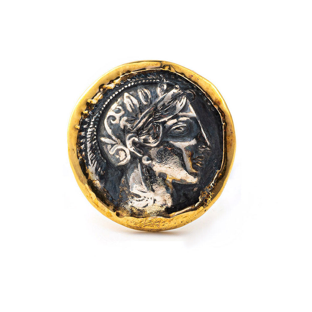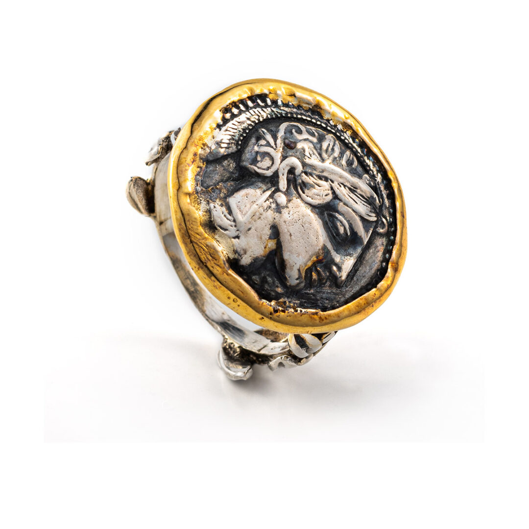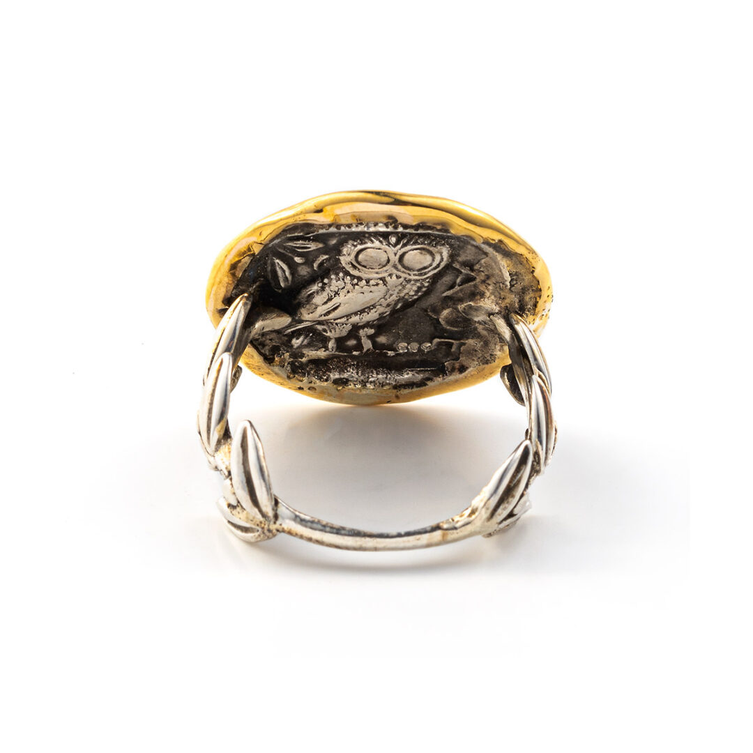 Goddess Athena and Owl Coin Ring – 14K Gold and 925 Sterling Silver