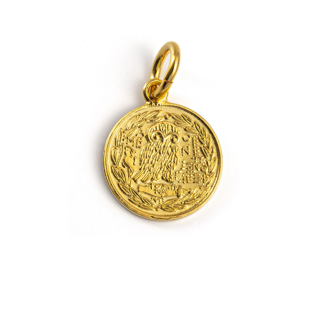 Dracma was the currency used in Greece during several periods in its history. The tetradrachm was an Ancient Greek silver coin equivalent to fourdrachmae in Athens it replaced the earlier “heraldic” type of didrachms and it was in wide circulation from ca. 510 to ca. 38 BC. This coin belongs to the so-called “new style Athenian coins” minted between 166 and 64 B.C. and is considered one of the most popular ancient Greek coins which illustrate the portrait of Goddess Athena on the one side and the wisdom owl on the other. Athena is an ancient Greek goddess associated with wisdom, handicraft, and warfare. Athena was regarded as the patron and protectress of various cities across Greece, particularly the city of Athens, from which she most likely received her name. She’s usually shown in art wearing a helmet and holding a spear. Her major symbols include owls, olive trees, and snakes. Her temples were located atop the fortified Acropolis in the central part of the city. The Parthenon on the Athenian Acropolis is dedicated to her, along with numerous other temples and monuments. Her main festival in Athens was the Panathenaia, which was celebrated in midsummer and was the most important festival on the Athenian calendar. In the classical Olympian pantheon, Athena was regarded as the favorite daughter of Zeus. The owl traditionally accompanies Athena. Because of such association, the owl has been used as a symbol of knowledge and wisdom. The inscriptions contain the city’s “national” appellation (“ΑΘΕ», i.e. “of the Athenians”). As in all handmade items, there may be small differences in weight and dimensions and this is what makes them unique and precious.