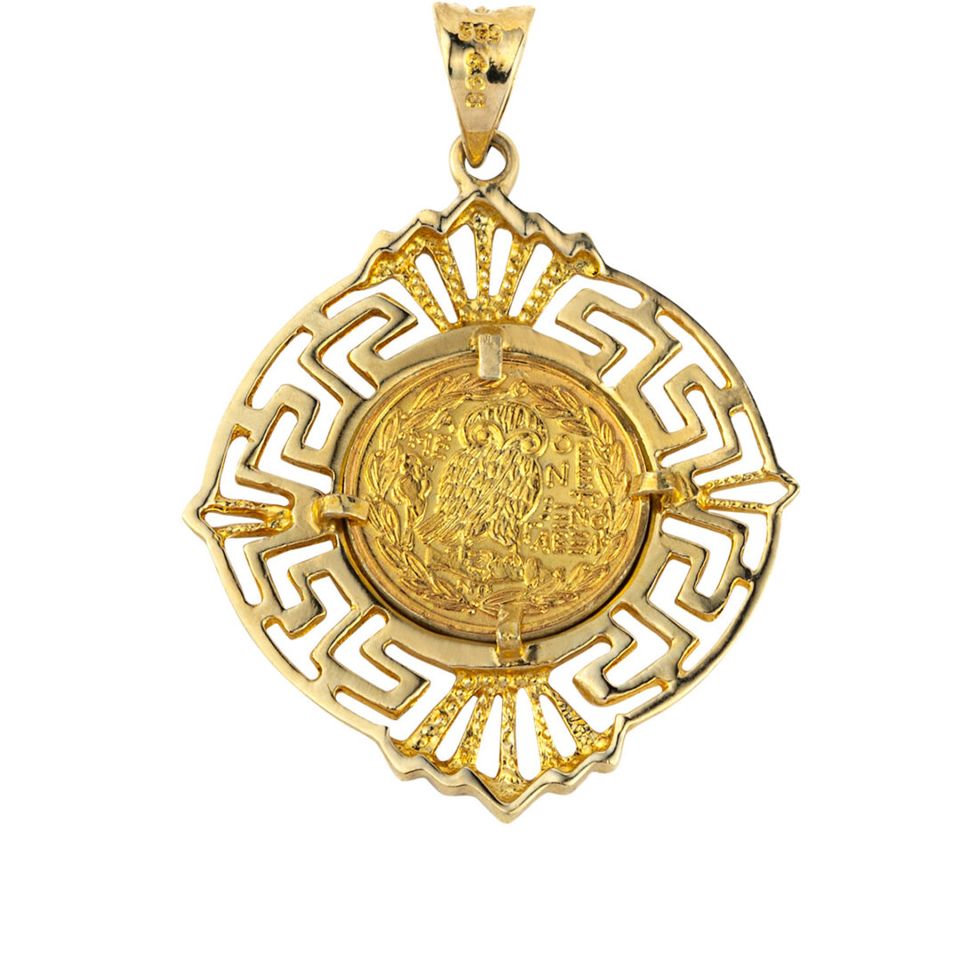 Goddess Athena and Owl Pendant with Greek Key – 14K Gold