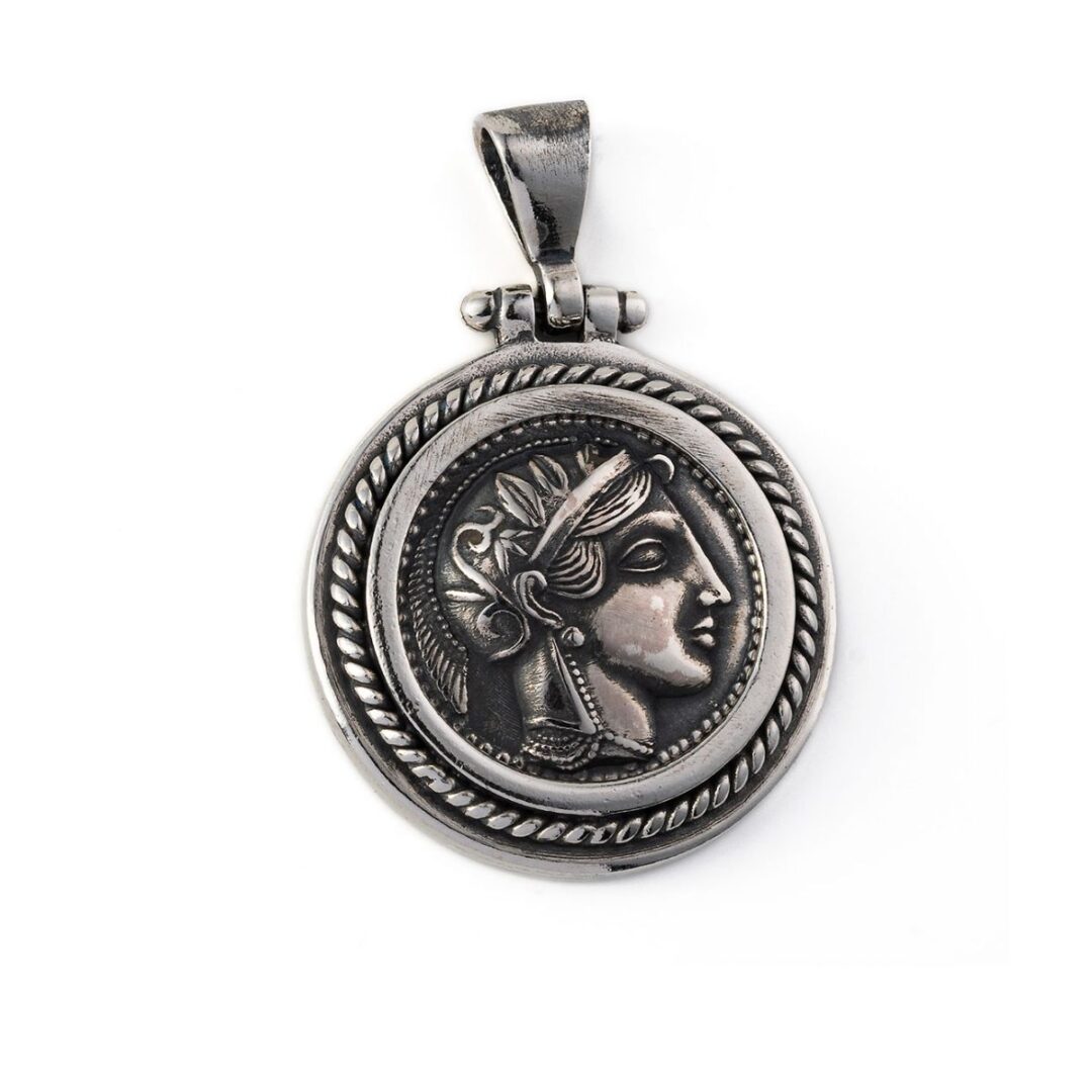 Dracma was the currency used in Greece during several periods in its history. The tetradrachm was an Ancient Greek silver coin equivalent to fourdrachmae in Athens it replaced the earlier “heraldic” type of didrachms and it was in wide circulation from ca. 510 to ca. 38 BC. This coin belongs to the so-called “new style Athenian coins” minted between 166 and 64 B.C. and is considered one of the most popular ancient Greek coins which illustrate the portrait of Goddess Athena on the one side and the wisdom owl on the other. Athena is an ancient Greek goddess associated with wisdom, handicraft, and warfare. Athena was regarded as the patron and protectress of various cities across Greece, particularly the city of Athens, from which she most likely received her name. She’s usually shown in art wearing a helmet and holding a spear. Her major symbols include owls, olive trees, and snakes. Her temples were located atop the fortified Acropolis in the central part of the city. The Parthenon on the Athenian Acropolis is dedicated to her, along with numerous other temples and monuments. Her main festival in Athens was the Panathenaia, which was celebrated in midsummer and was the most important festival on the Athenian calendar. In the classical Olympian pantheon, Athena was regarded as the favorite daughter of Zeus. The owl traditionally accompanies Athena. Because of such association, the owl has been used as a symbol of knowledge and wisdom. The inscriptions contain the city’s “national” appellation (“ΑΘΕ», i.e. “of the Athenians”).