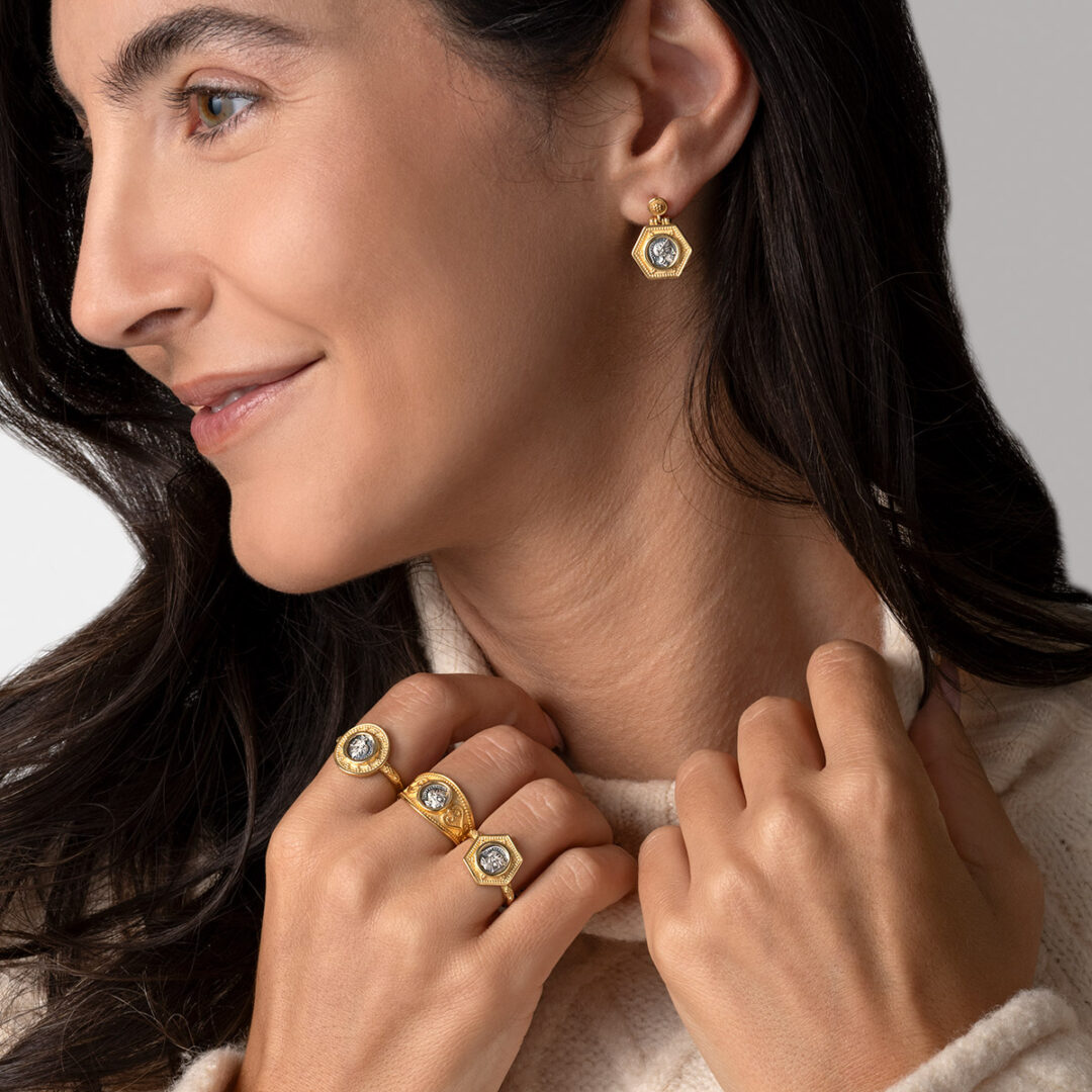 Earrings inspired by the ancient Greek tetradrachm.