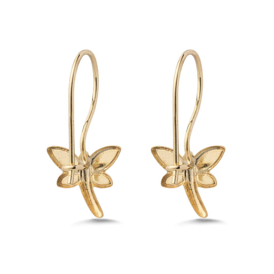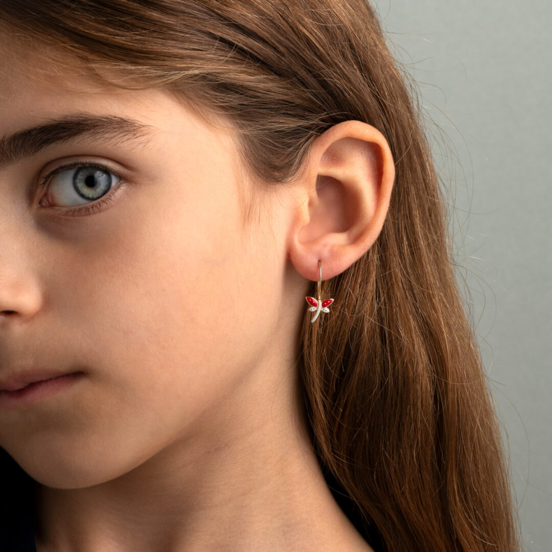 Adorable 9K gold butterfly dangle earrings for girls, featuring white and red enamel, a sweet and colorful jewelry gift for little ones.