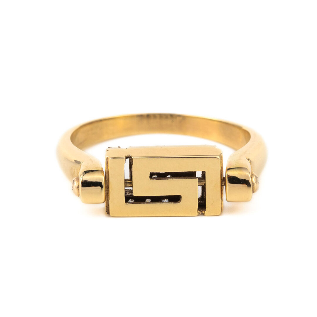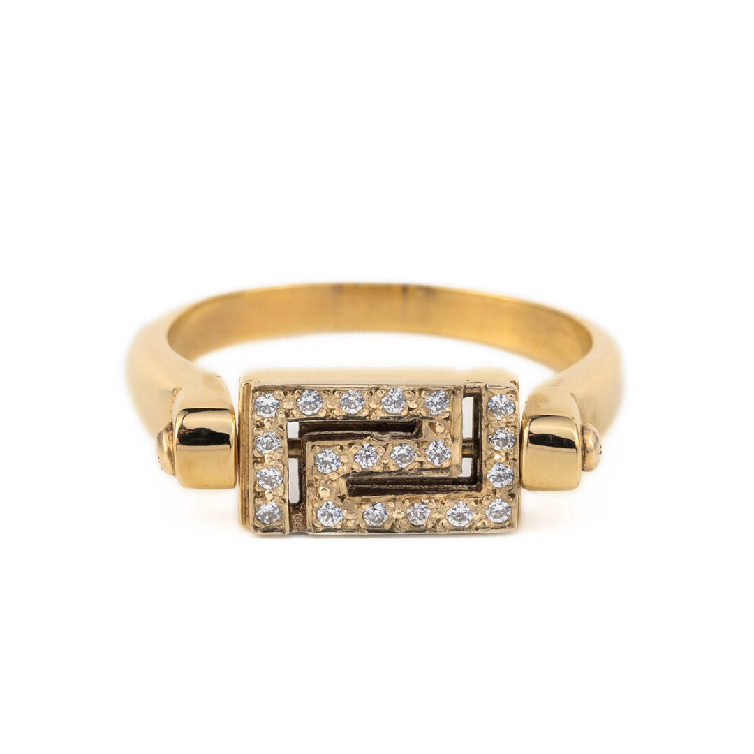 Meander Ring in 14k Gold with white crystals inspired by the ancient Greek design the Meander or Greek Key.