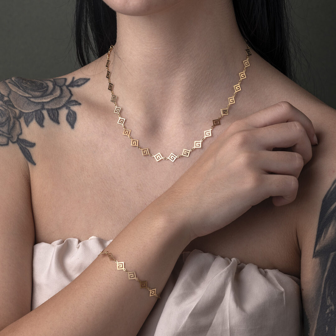 Meandros design is a decorative border constructed from a continuous line, shaped into a repeated motif. Such a design is also called the Greek fret or Greek key design, although these are modern designations. On the one hand, the name “meander” recalls the twisting and turning path of the Meander River in Asia Minor, and on the other hand, as Karl Kerenyi pointed out, “the meander is the figure of a labyrinth in linear form” the meaning is that there is no beginning and no end in some cases so it becomes the symbol of long life and eternity.