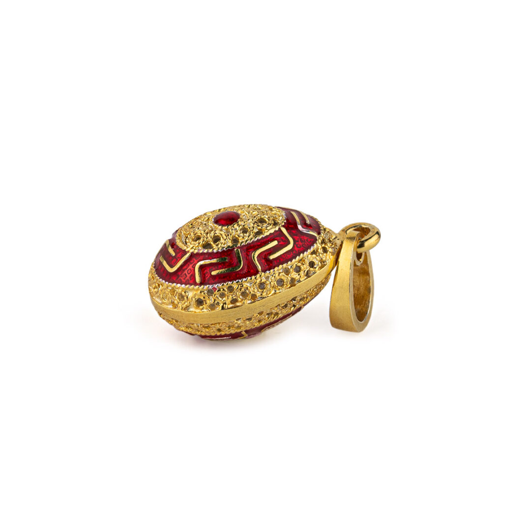The pendant is embellished with a fine filigree and red enamel in Faberge style. Also the pendant decorated with Meander – Greek Key design.