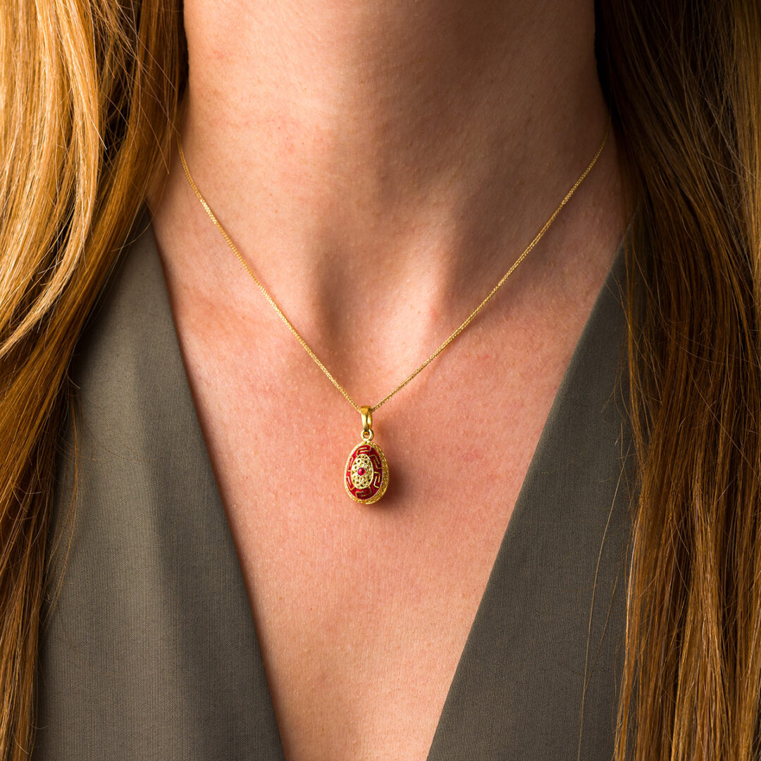 Greek Key Filigree Egg Pendant Necklace with Red Enamel – Sterling Silver Gold Plated