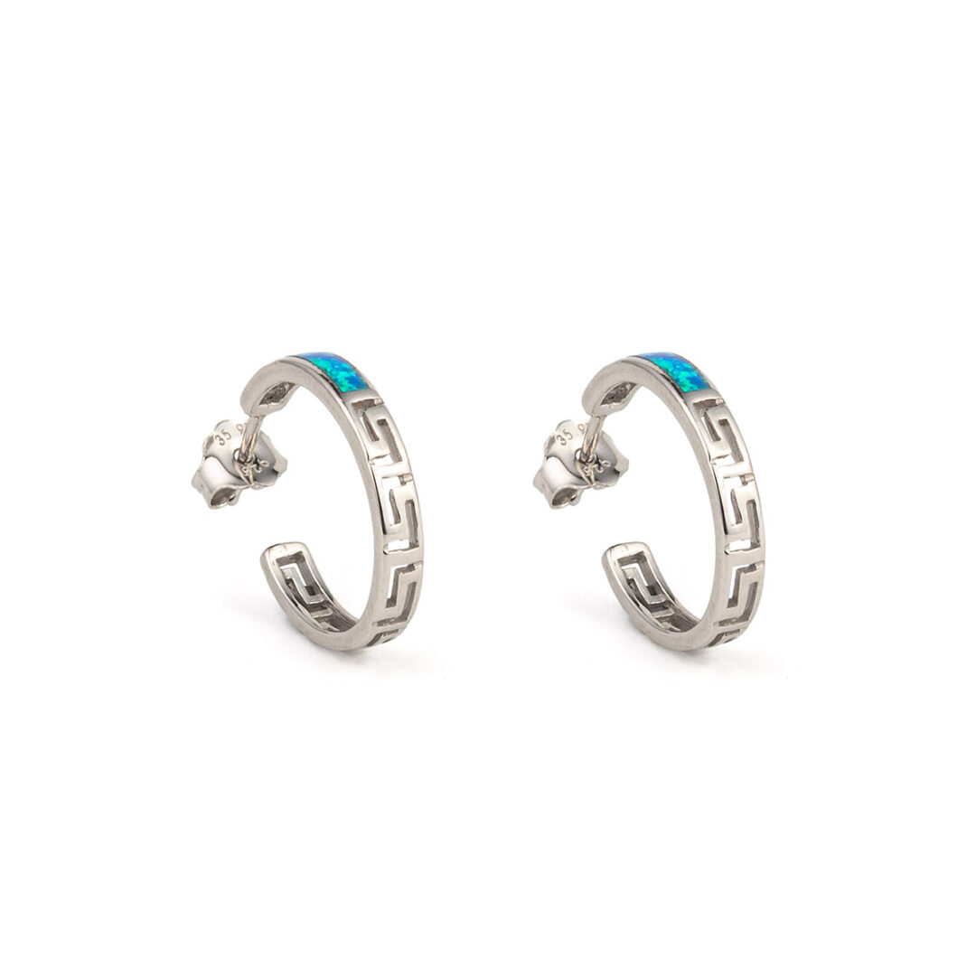 Greek Key Hoop Opal Earrings in 925 Sterling Silver