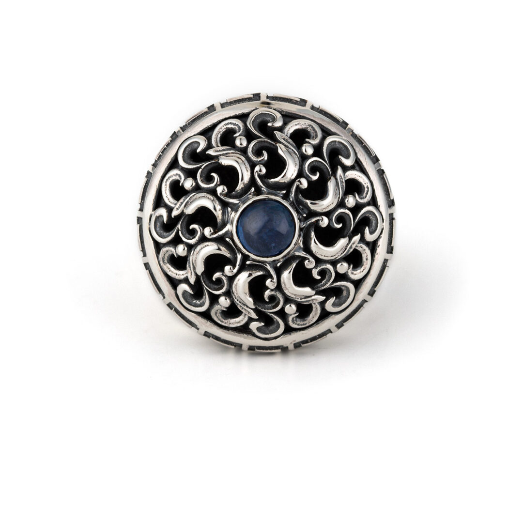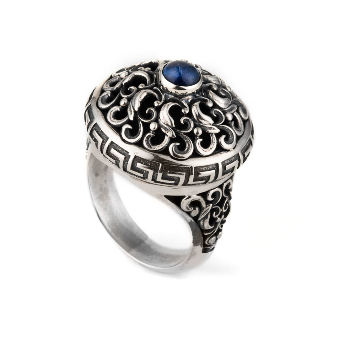 Greek Meander Floral Lapis Ring – Sterling Silver Yianni JewelryΤhis is an impressive oxidized ring made of sterling silver 925 and decorated with a lapis lazuli gemstone at the center.