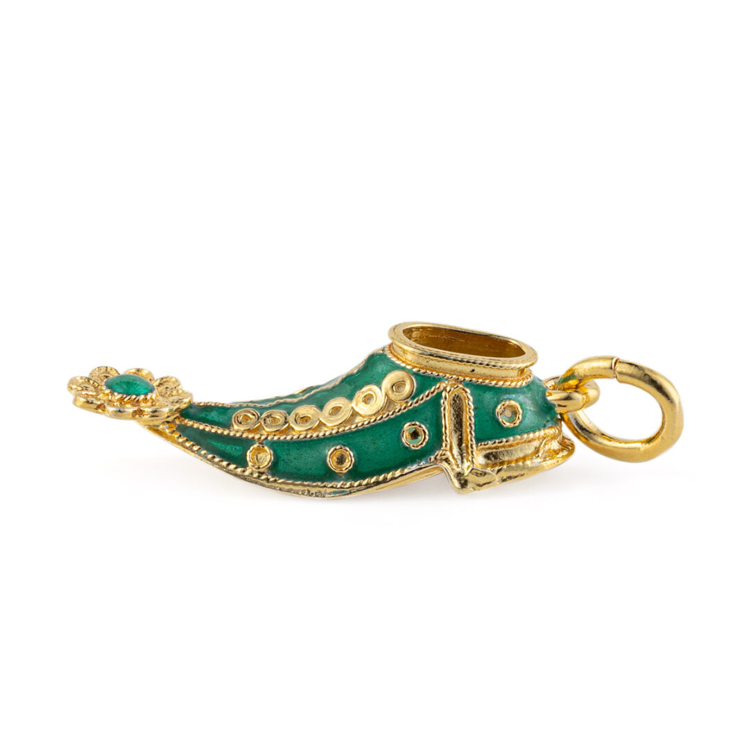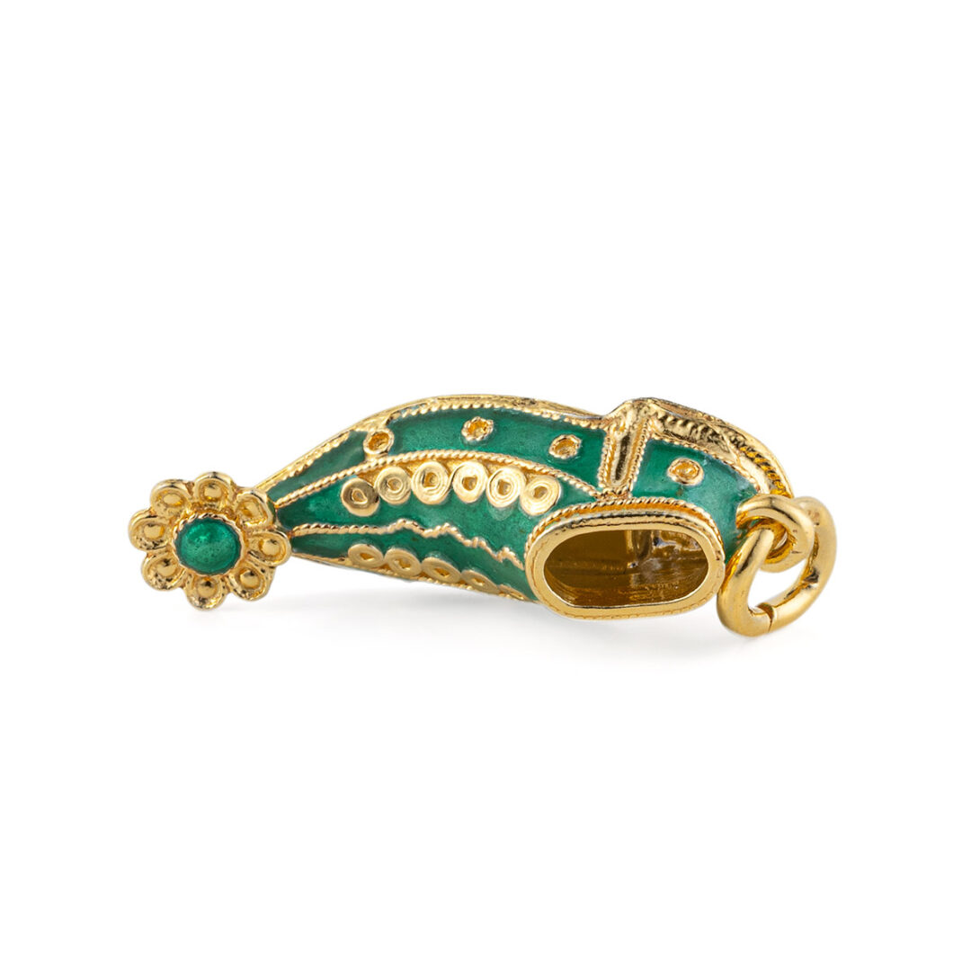 Have you witnessed the changing of the guards in Syntagma square? This is the most traditional shoe of Greece (tsarouhi). The pendant is decorated with green enamel and rosette motif.