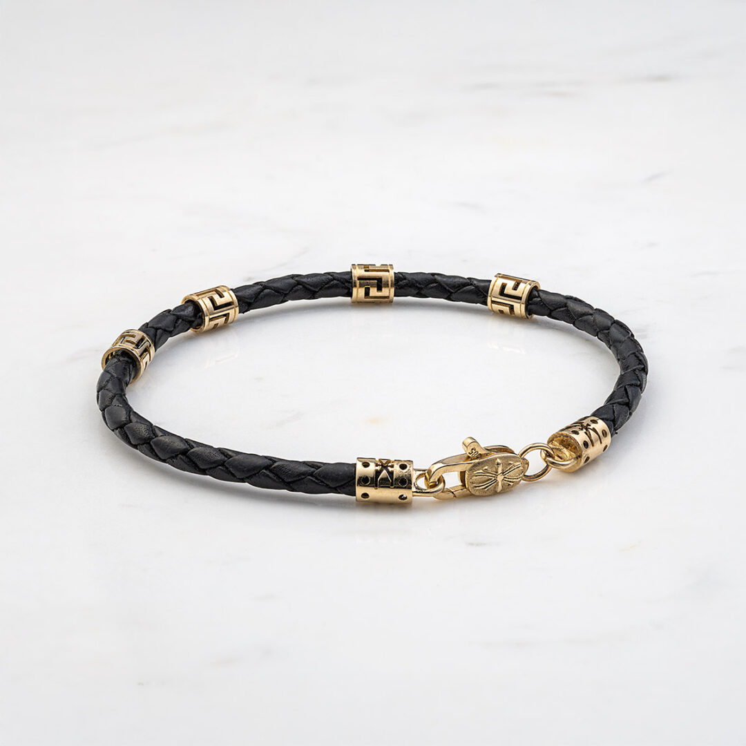 Bracelet with Sterling Silver & K14 Gold with Greek key motifs and braided genuine leather.