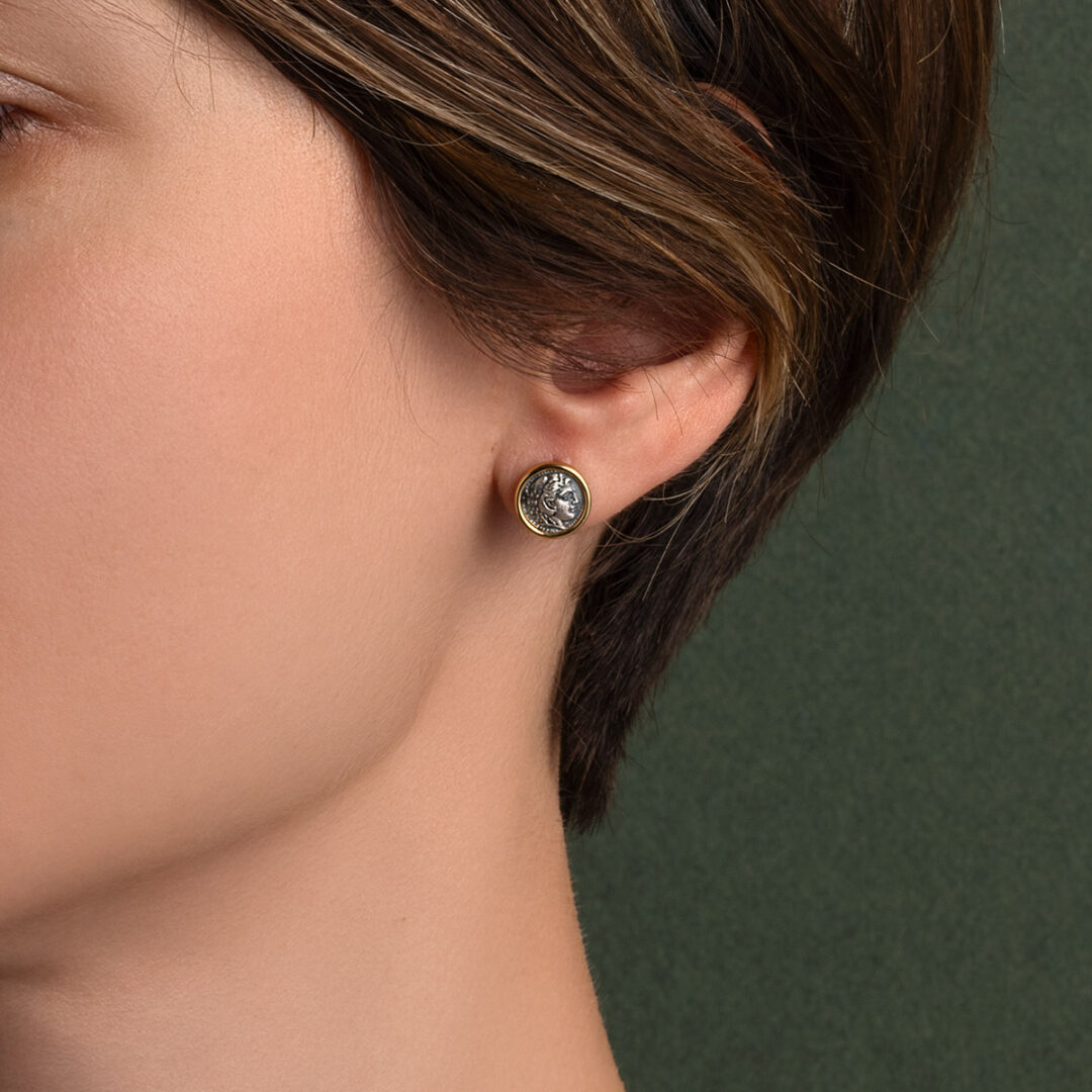 Handmade earrings inspired by the ancient Greek tetradrachm coin, depicting Hercules.