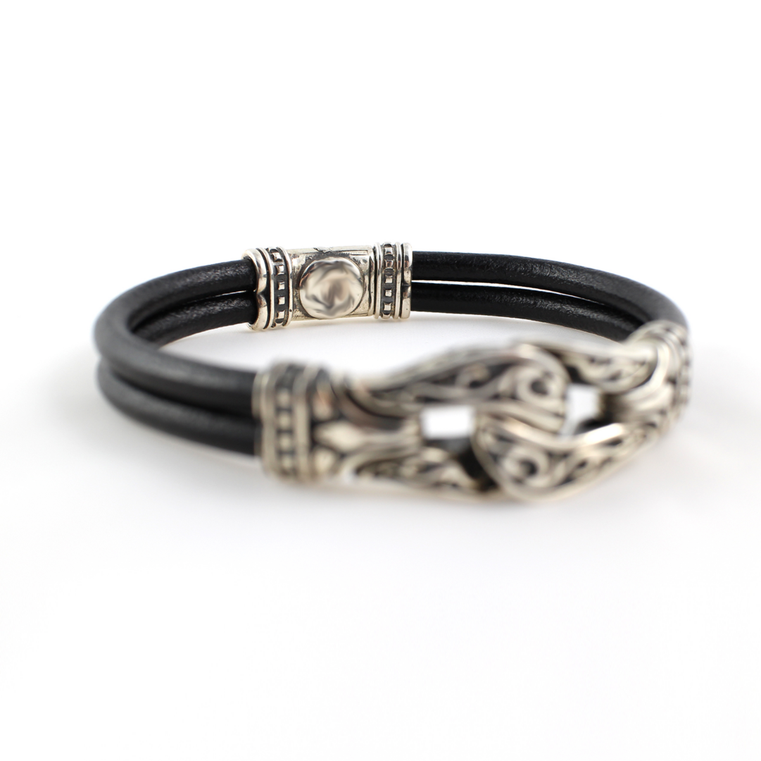 It features two rows of smooth black leather cords with an engraved sterling silver clasp to hold them in place. The unique rope knot station in the front is etched with a free flow design in sterling silver with darkened crevices.