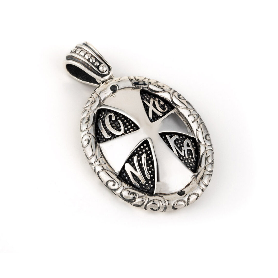 Τhe cross is placed in an oval frame on which the ”ICXC NIKA” is engraved. IC XC NI KA symbol: IC XC for “Jesus Christ” and NI KA for “conquered”. The Byzantine symbol is also known as “En Touto Nika”.