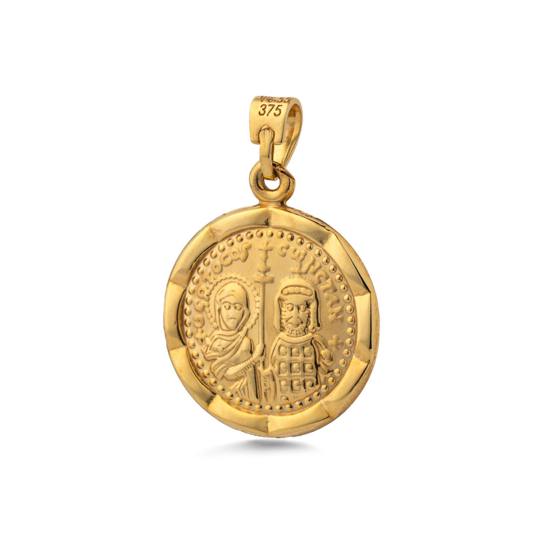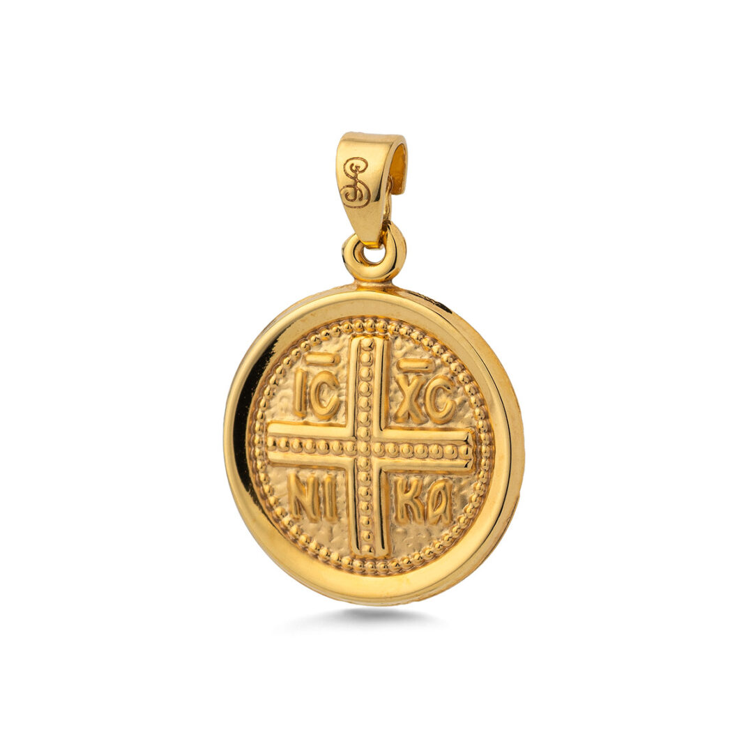 A handmade gold pendant that depicts Christogram with the initials IC XC NIKA (Jesus Christ conquers).