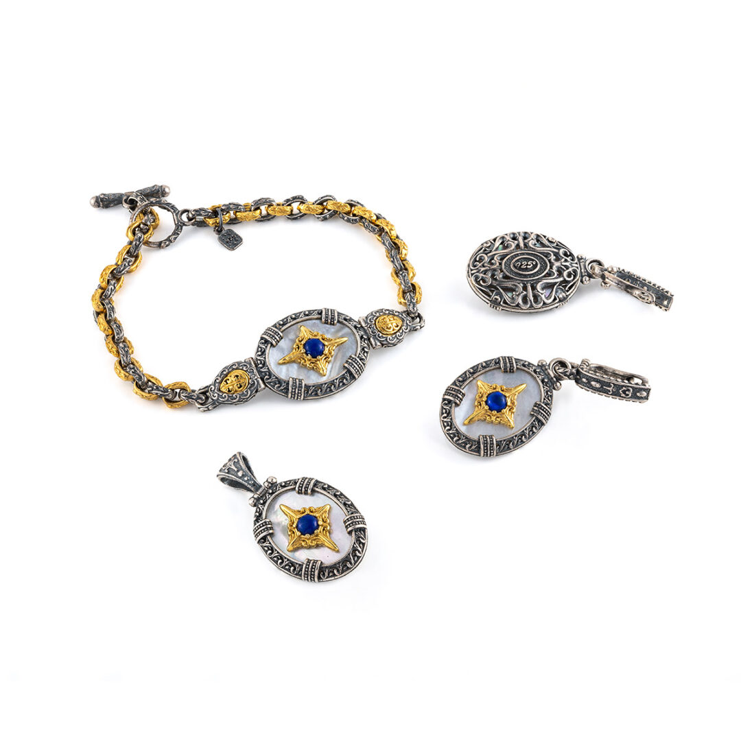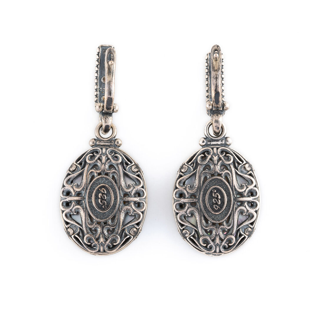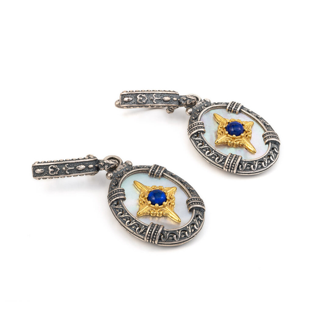 These earrings are inspired by Byzantine Historical period respecting Greek traditional art. A very elegant pair of earrings decorated with lapis lazuli gemstone.