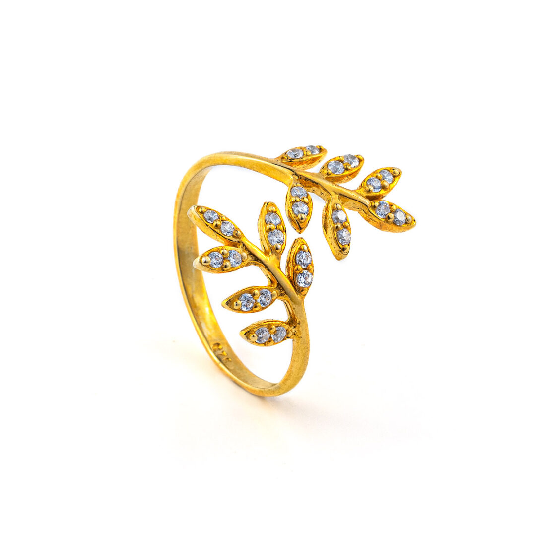 Leaf Adjustable Ring with Zircon – 14K Solid Yellow Gold