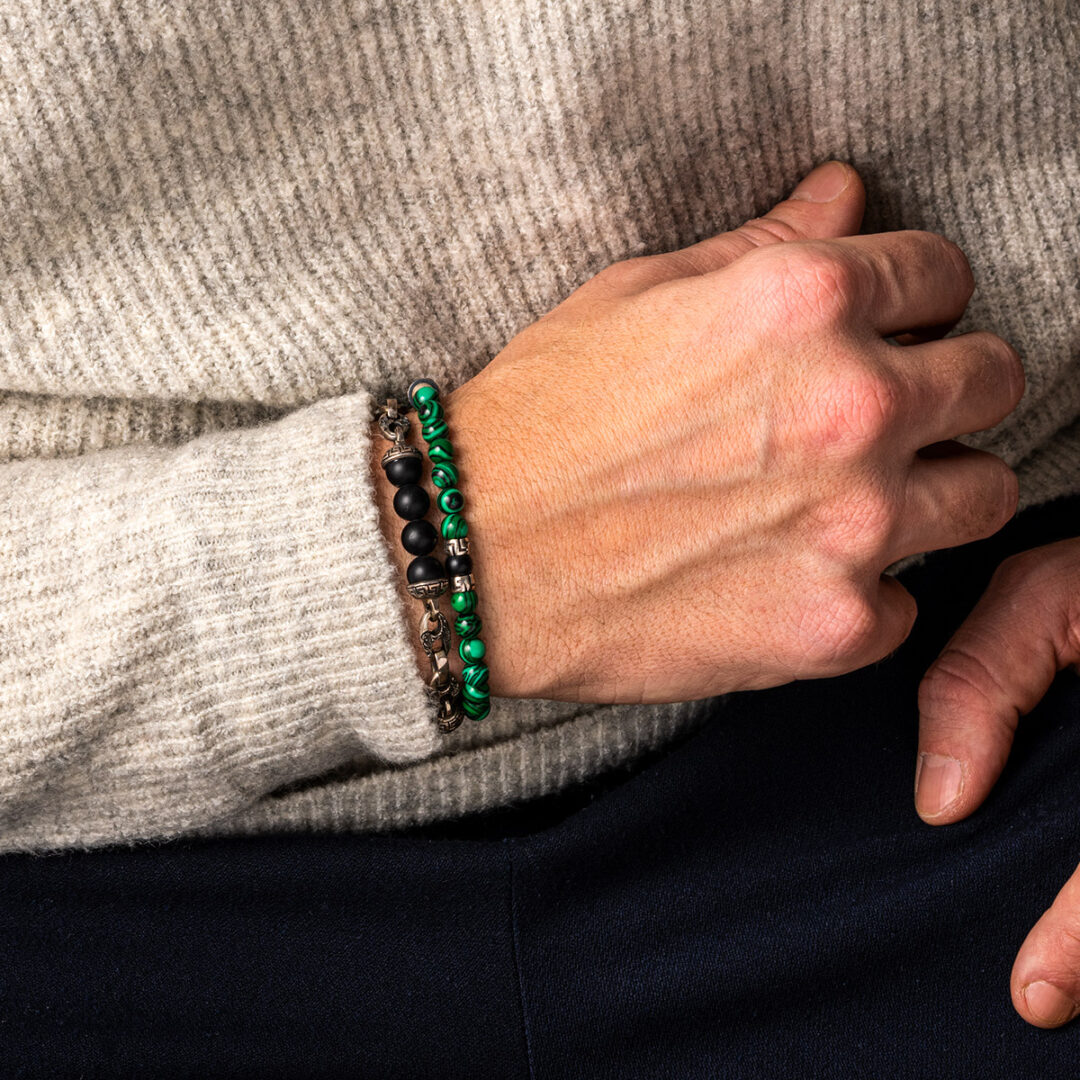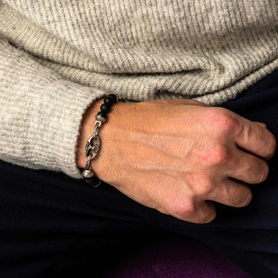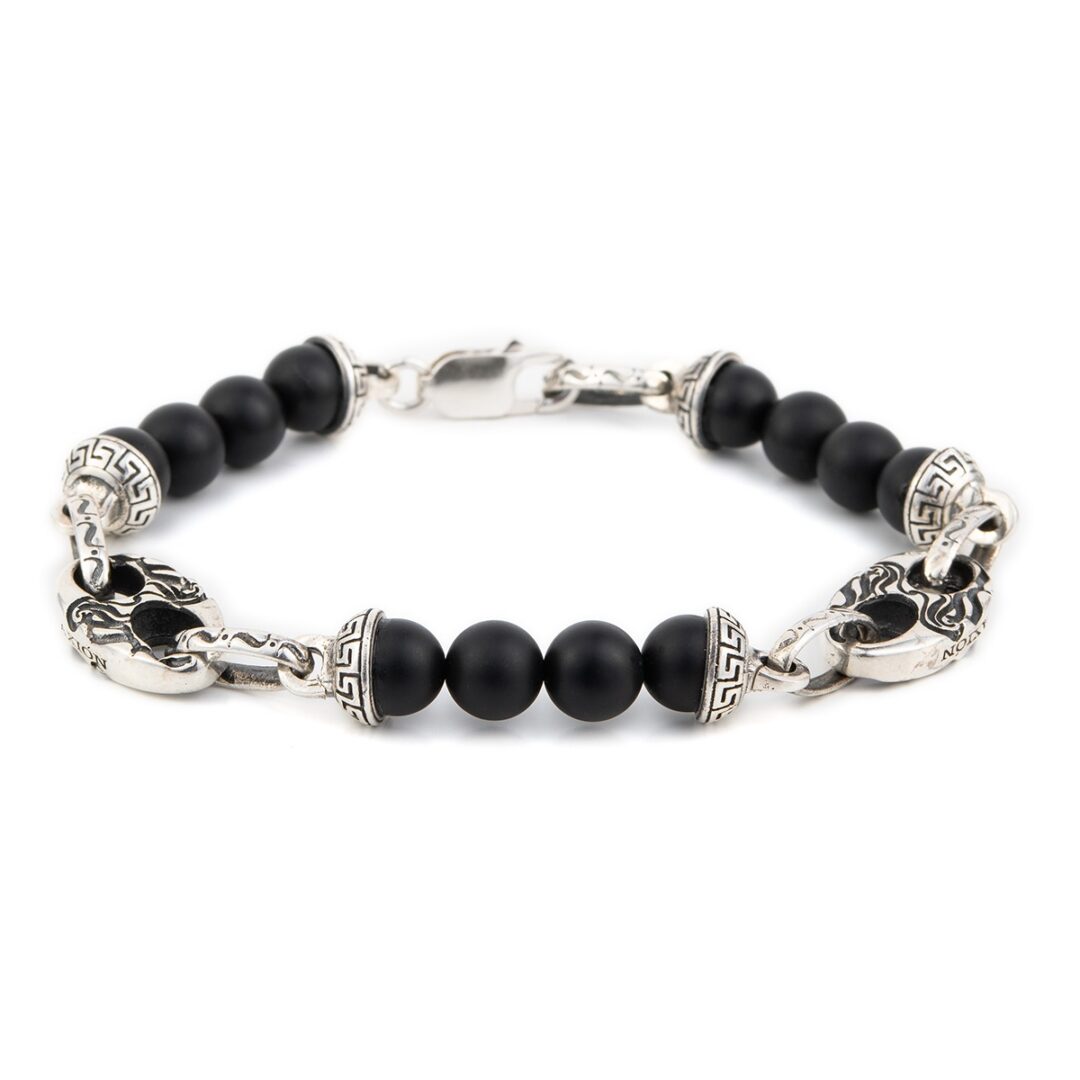 Sterling silver bracelet with meander motifs, theta links and 8mm onyx matte beads.
