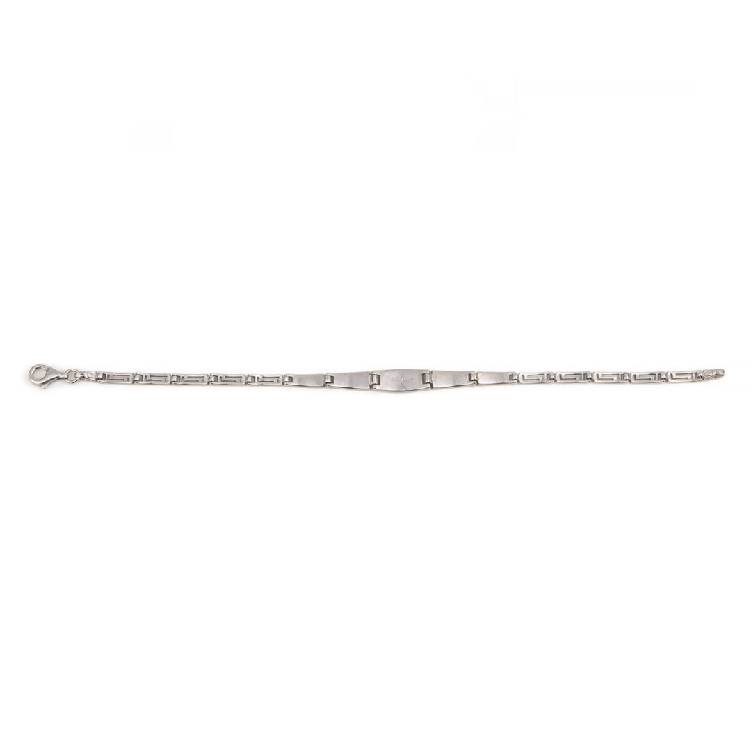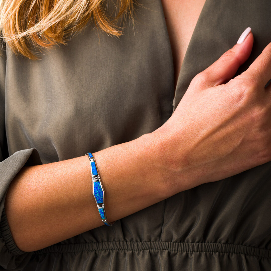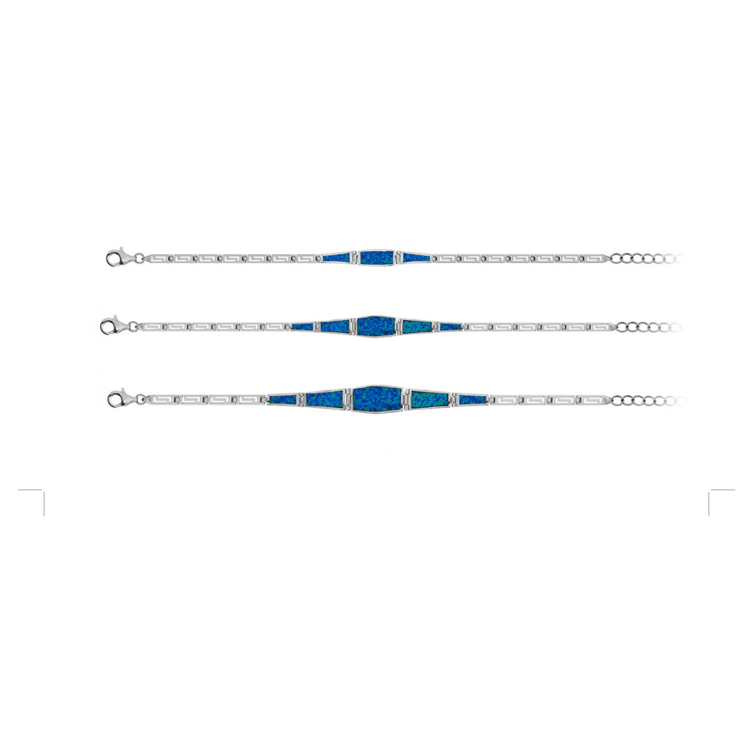Link Bracelet with Meander design and blue opal stones. Meander design is a decorative border constructed from a continuous line, shaped into a repeated motif. Such a design is also called the Greek fret or Greek key design, although these are modern designations. One the one hand, the name “meander” recalls the twisting and turning path of the Meander River in Asia Minor, and on the other hand, as Karl Kerenyi pointed out, “the meander is the figure of a labyrinth in linear form” the meaning is that these is no beginning and to end end in some cases so it become the symbol of long life and eternity.