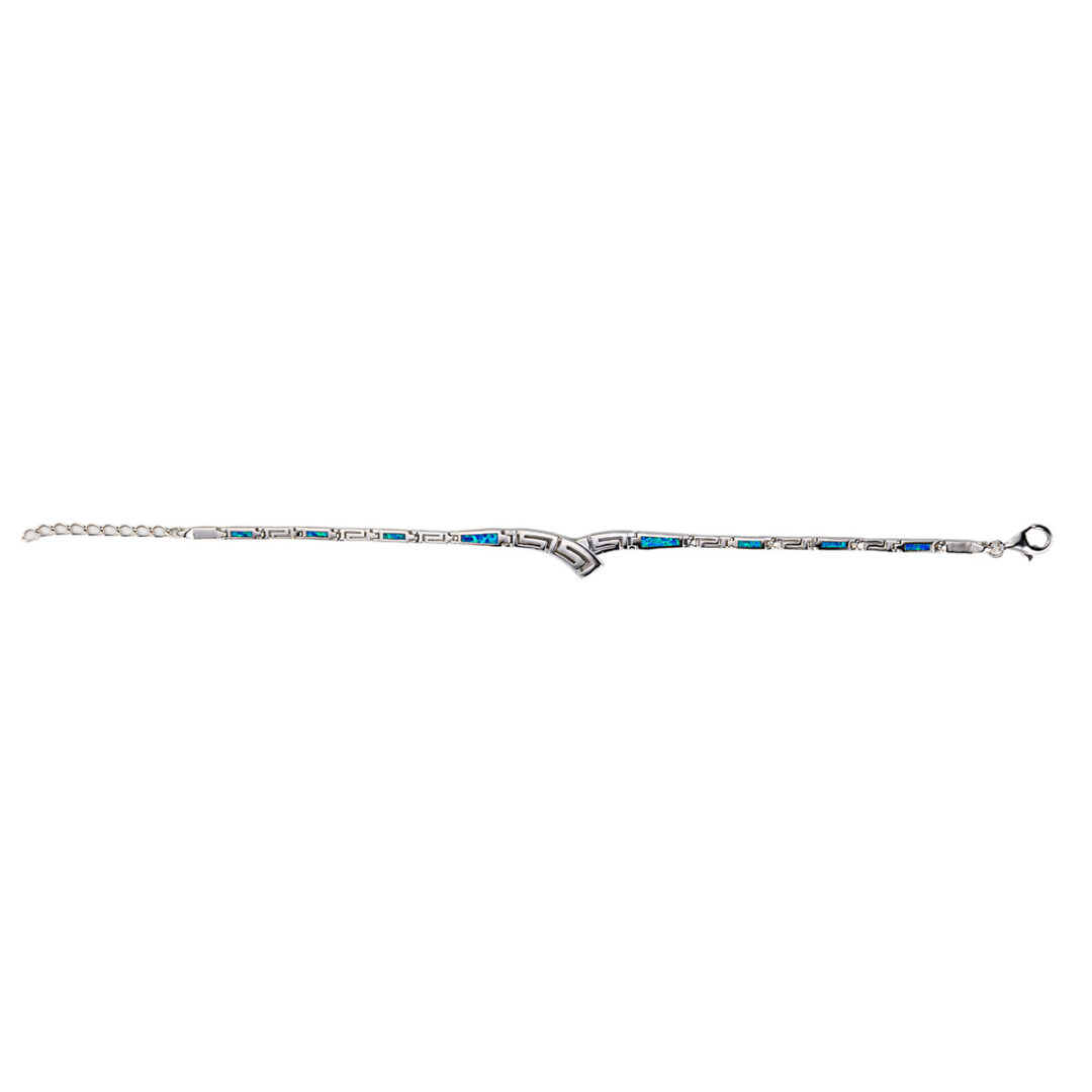 A sterling silver bracelet inspired by the ancient Meander motif with bright blue opal gems.