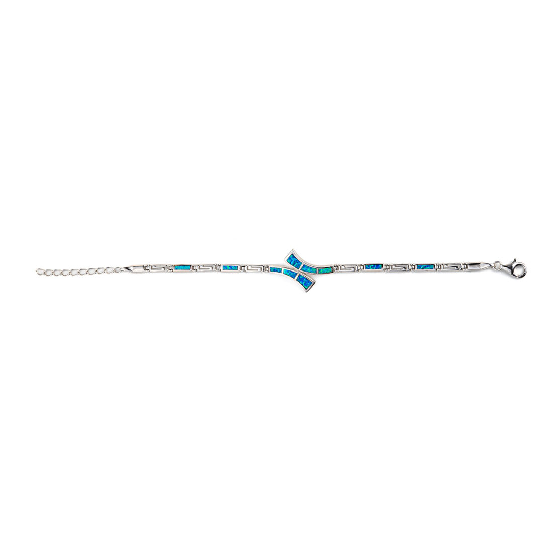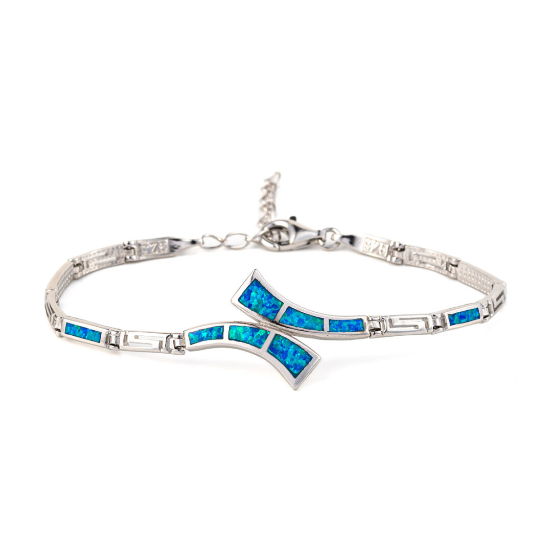 A sterling silver bracelet inspired by the ancient Meander symbol with bright blue opal stones.