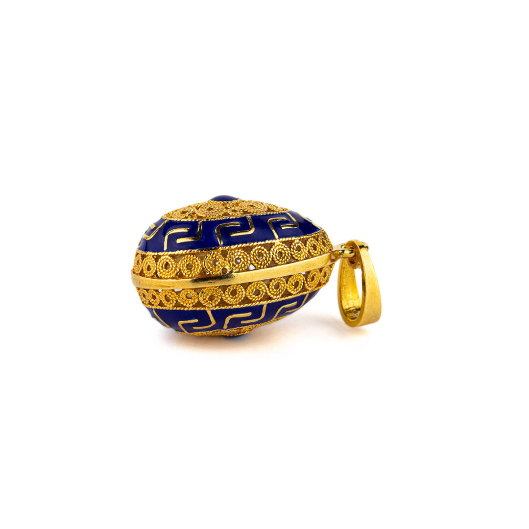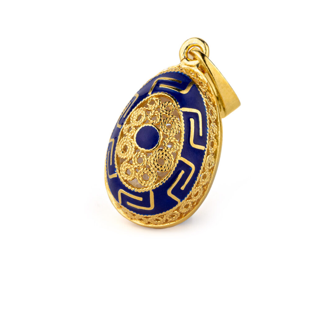 Meander Filigree Egg Pendant Necklace with Blue Enamel – Sterling Silver Gold Plated