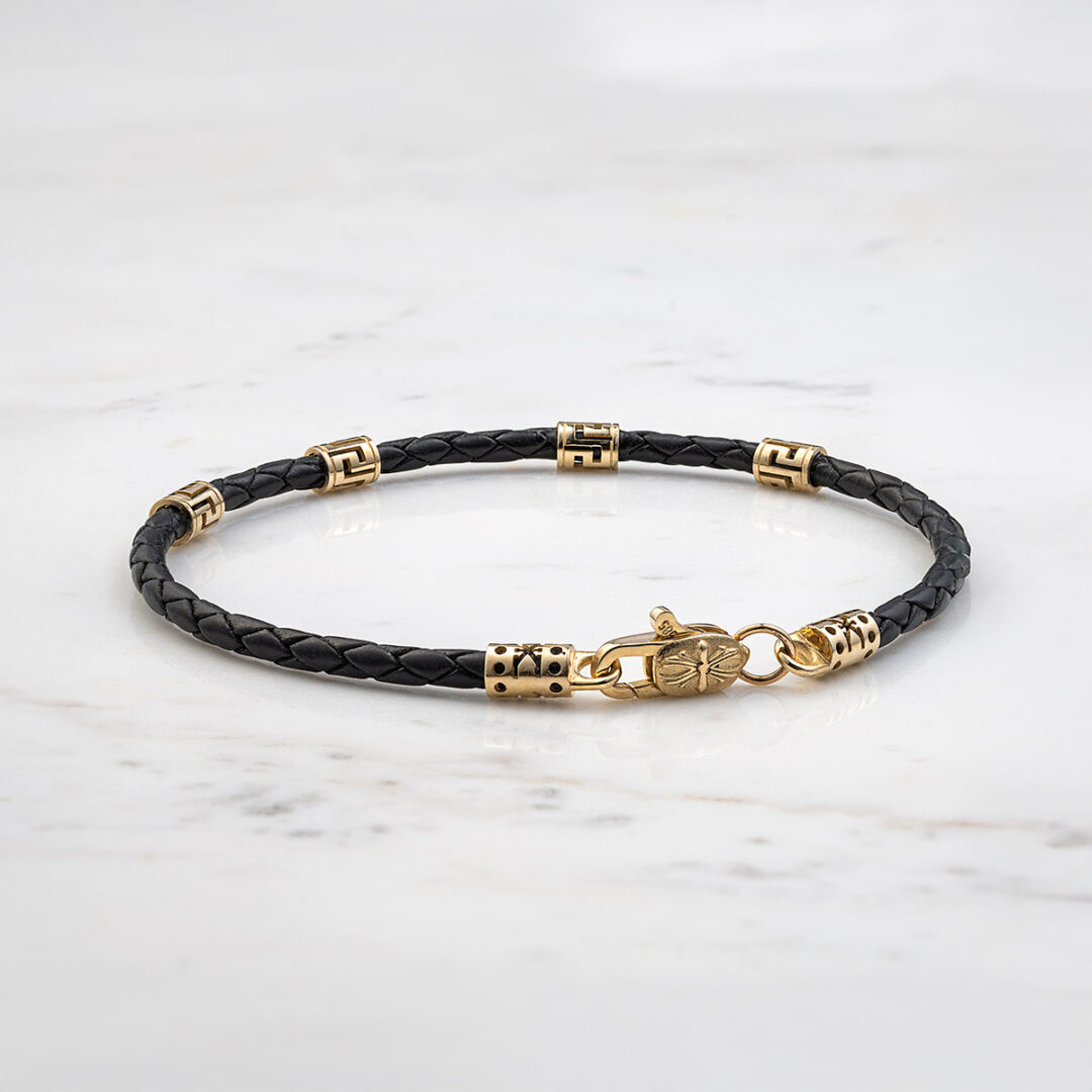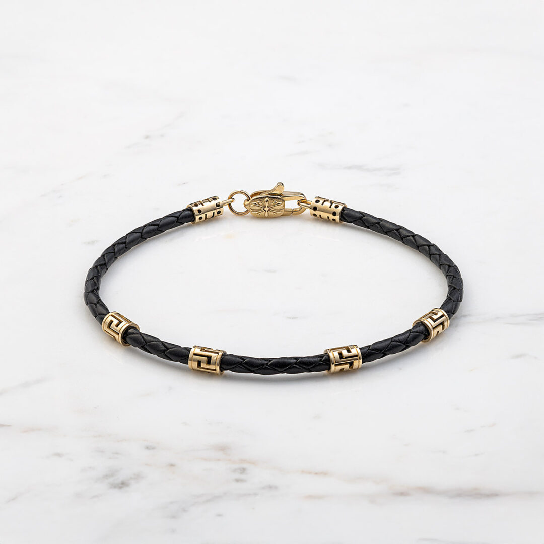 Bracelet with Sterling Silver & K14 Gold with Greek key motifs and braided genuine leather.