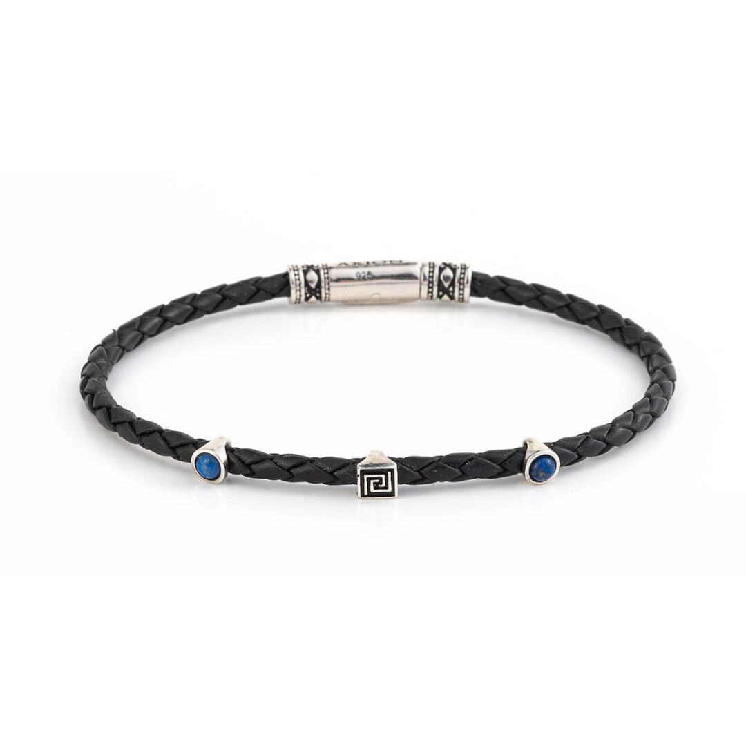 Sterling silver bracelet with greek key motif, black genuine leather and lapis stone.