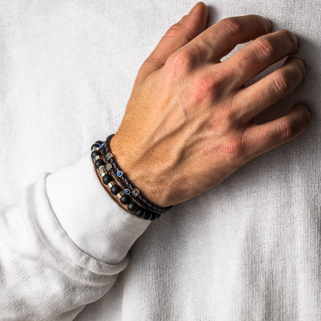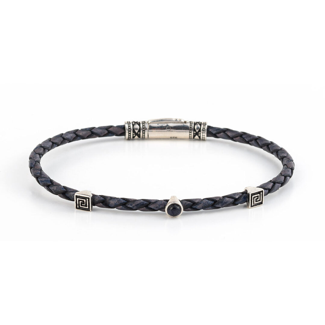 Sterling silver bracelet with greek key motif, black genuine leather and lapis stone.