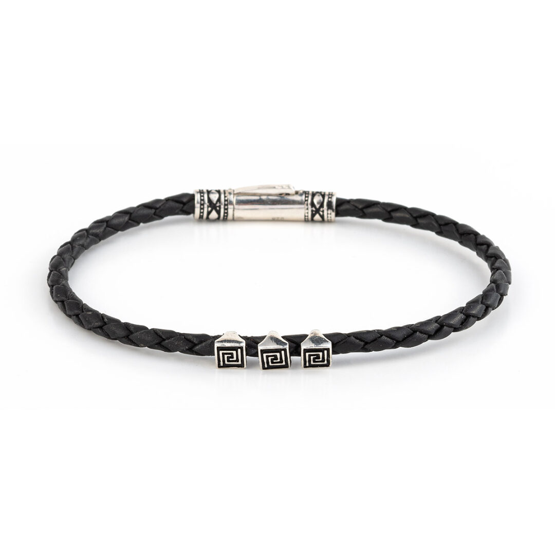 Sterling silver bracelet with greek key motif and black genuine leather.