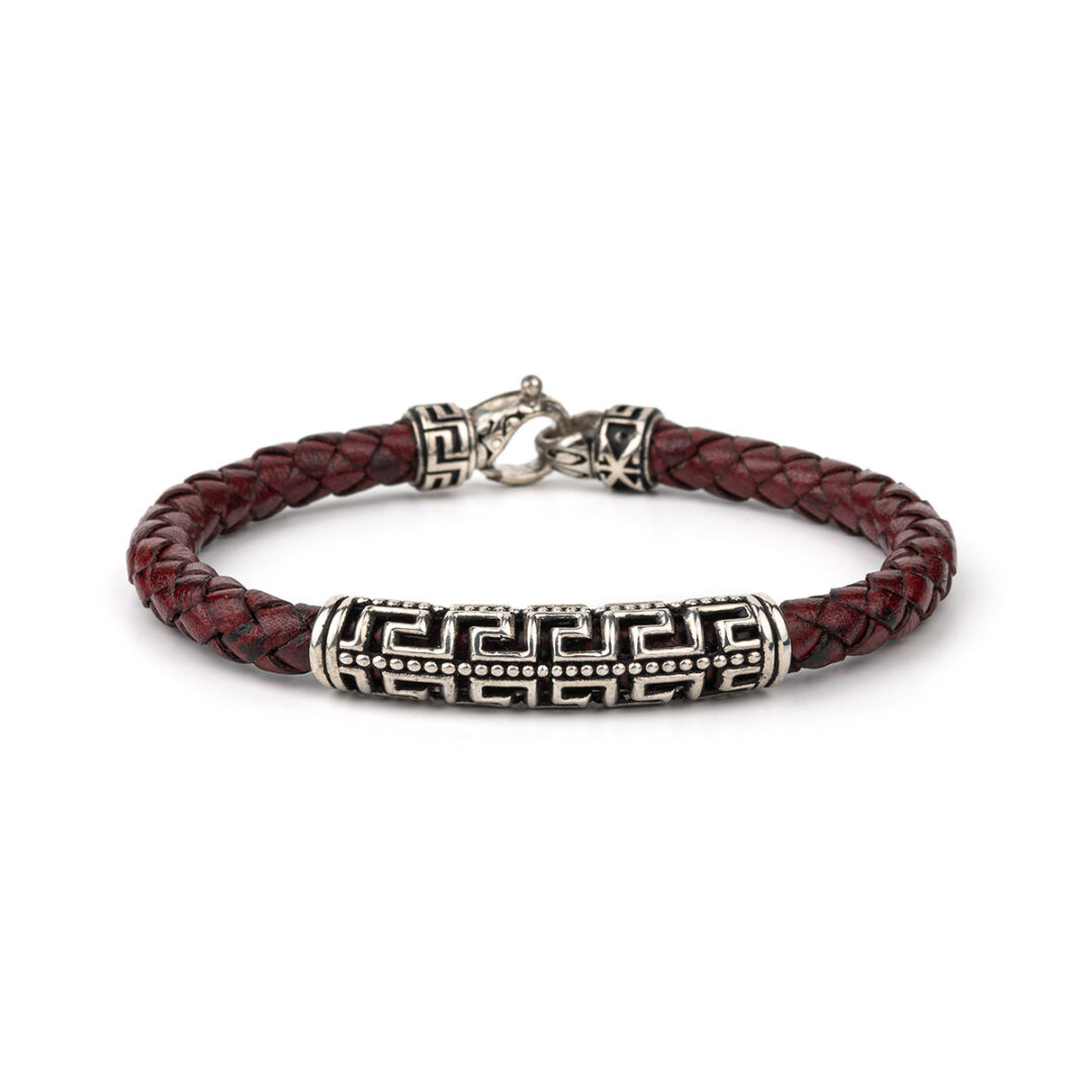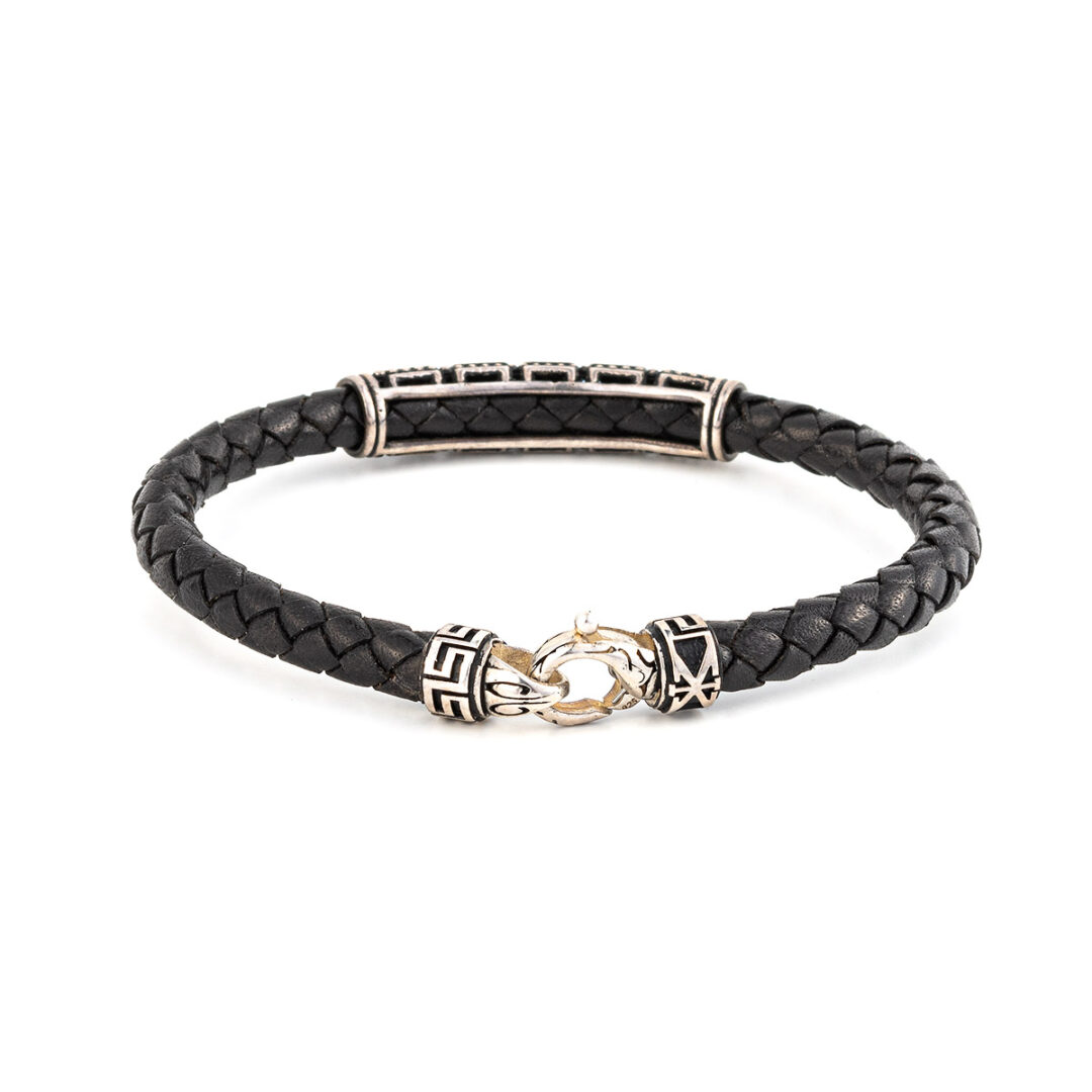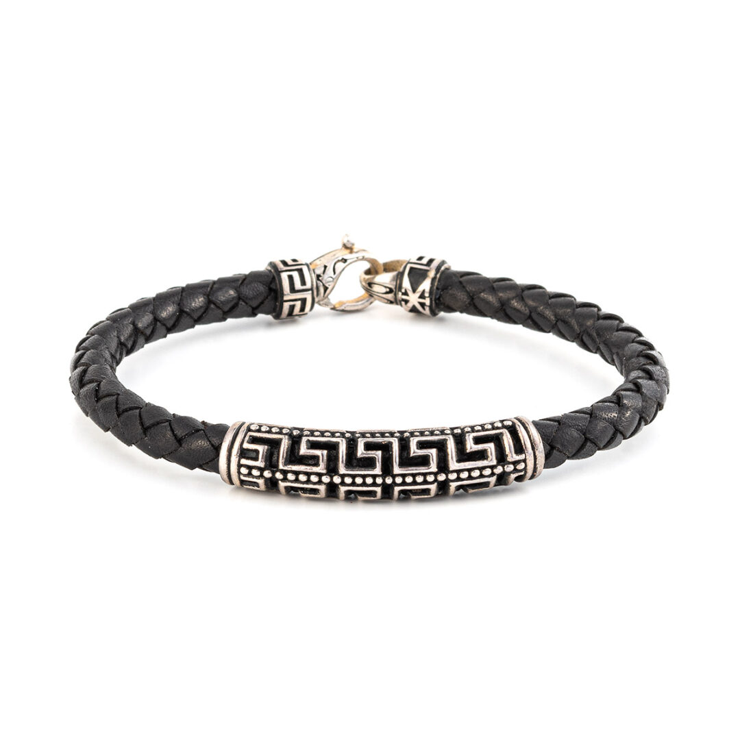 Meander Leather Bracelet – 925 Sterling Silver. Bracelet with Sterling Silver double Greek key motif and 5mm braided genuine leather. Handmade item.